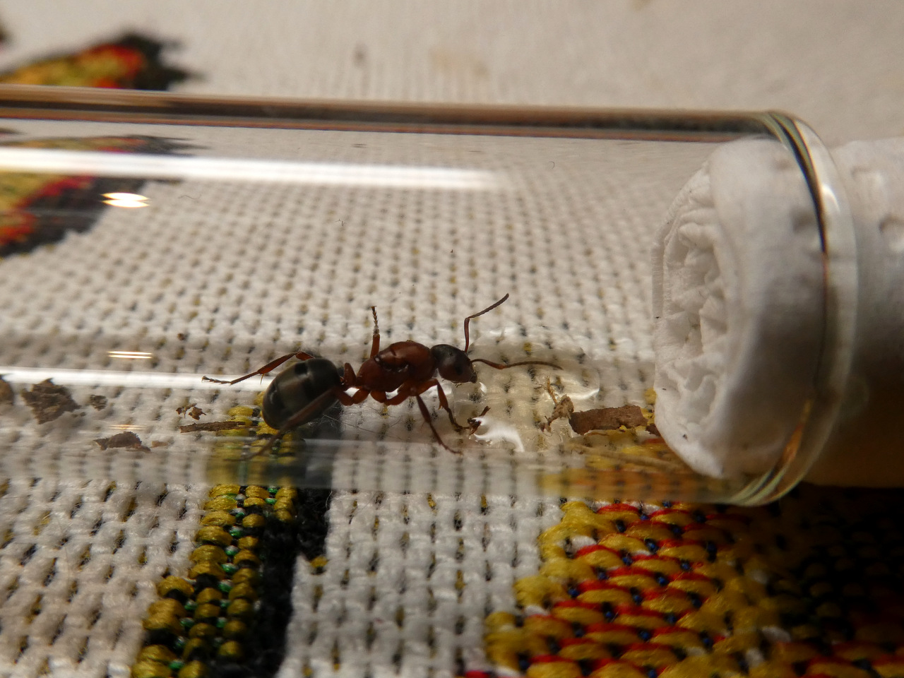 Ich schüttete der Gyne die Puppen direkt vor die Nase und nachdem sie erstmal alles vorsichtig mit ihren Fühlern beschnüffelt hatte, fing sie an, sie ein bisschen zu ordnen, was ich schonmal als Zeichen wertete, dass sie die Puppen annahm. Ich dachte mir, ein Tropfen Zuckerwasser tut ihr sicher gut und aus irgendeinem Grund kam ich auf die geniale Idee, sie direkt mit einer Kanüle zu füttern. Das mag bei anderen Ameisen funktionieren aber in diesem Fall war das keine gute Idee.
