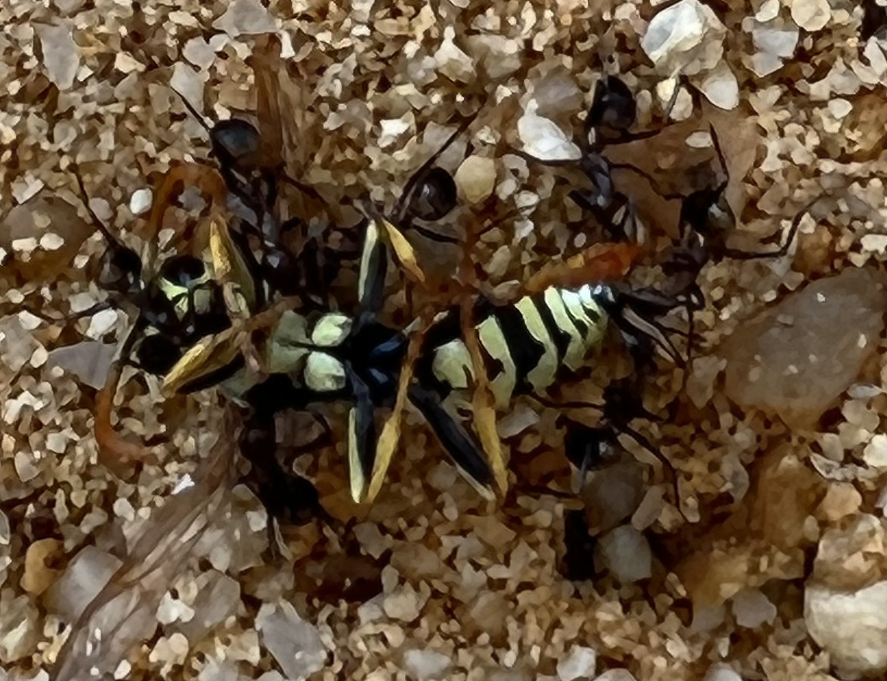 Erst hat sich nur eine ganz vorsichtig rangetraut, recht schnell waren dann aber 3, dann 5 und jetzt 8 Arbeiterinnen an der Wespe.