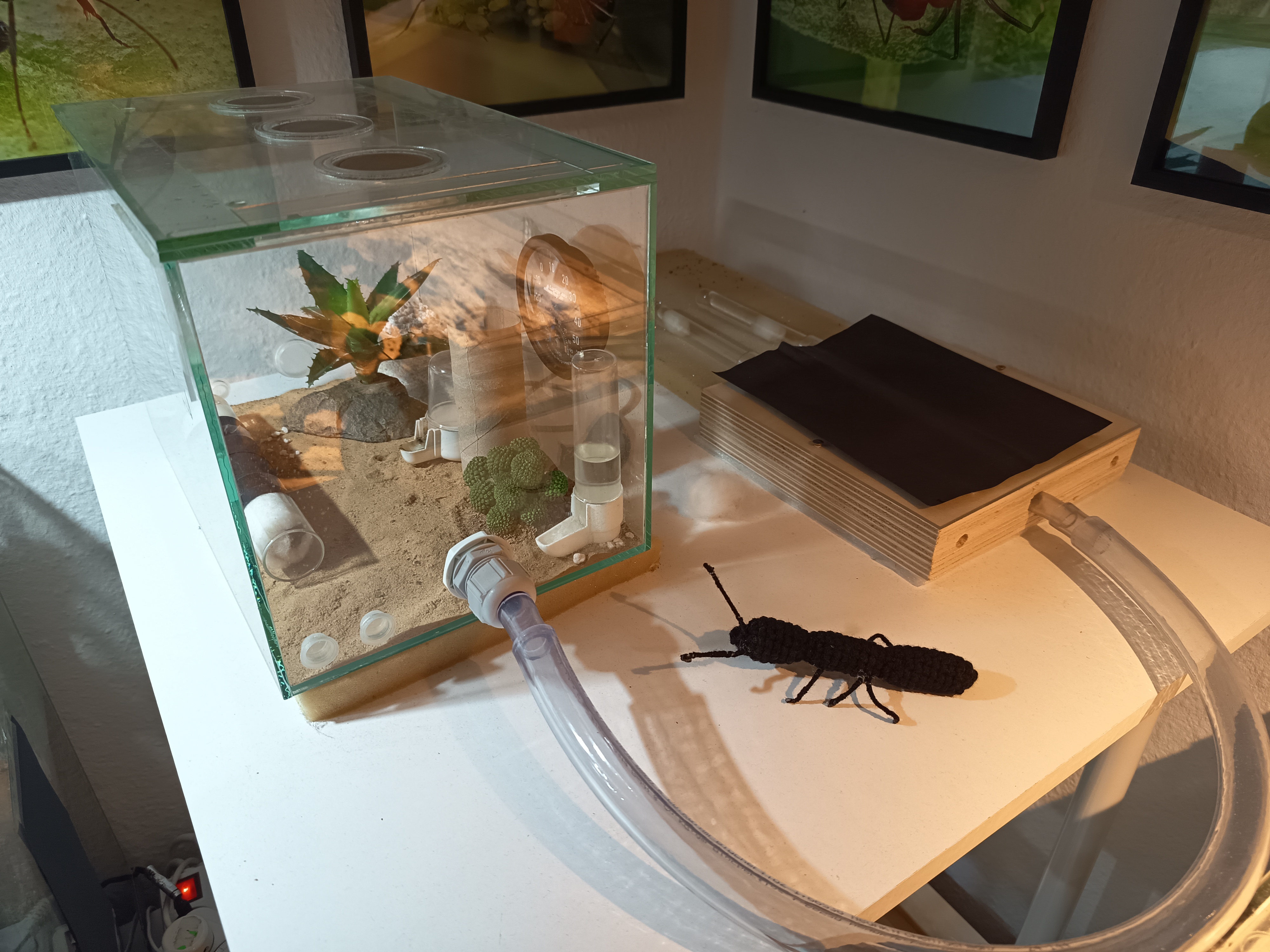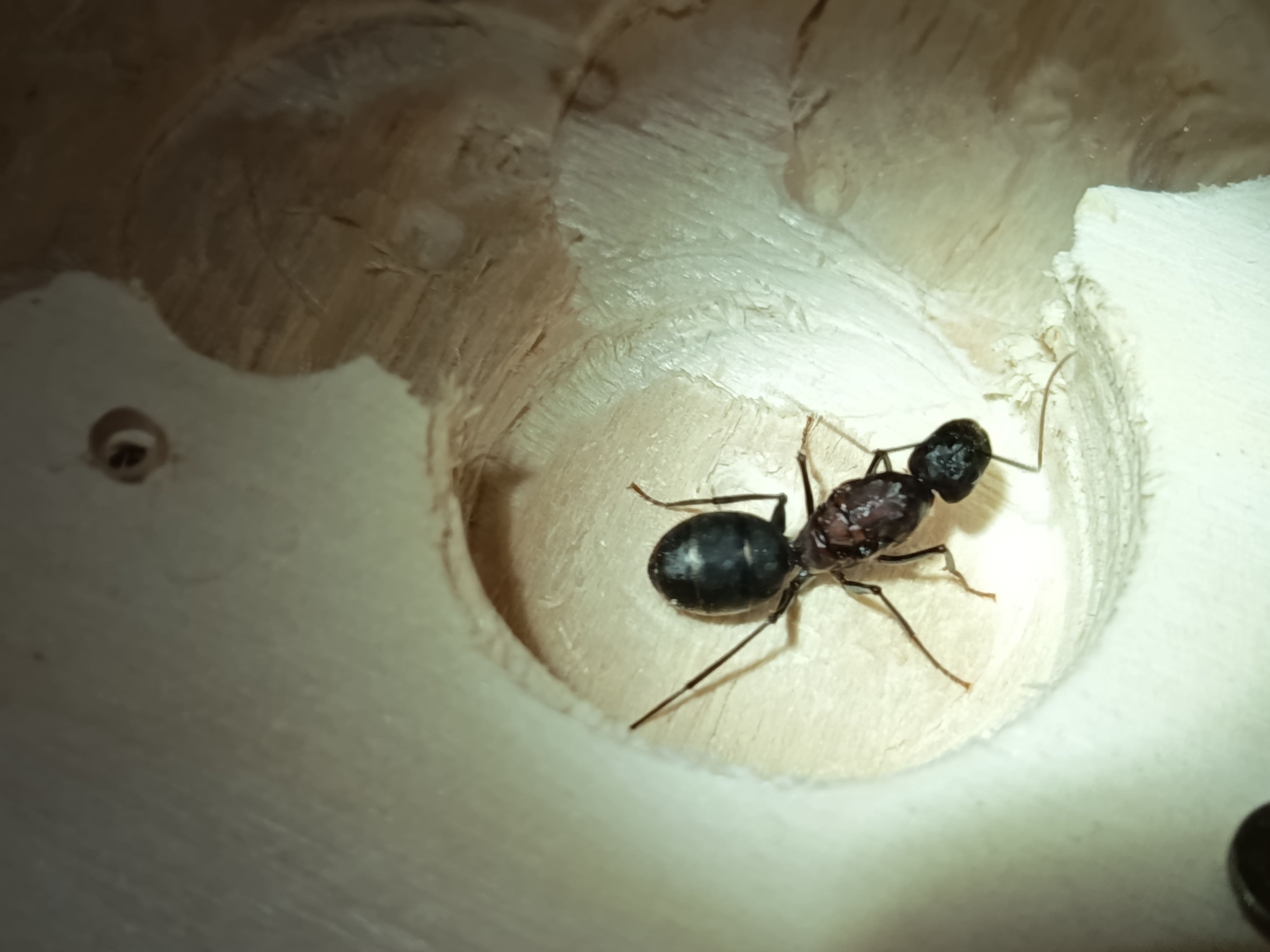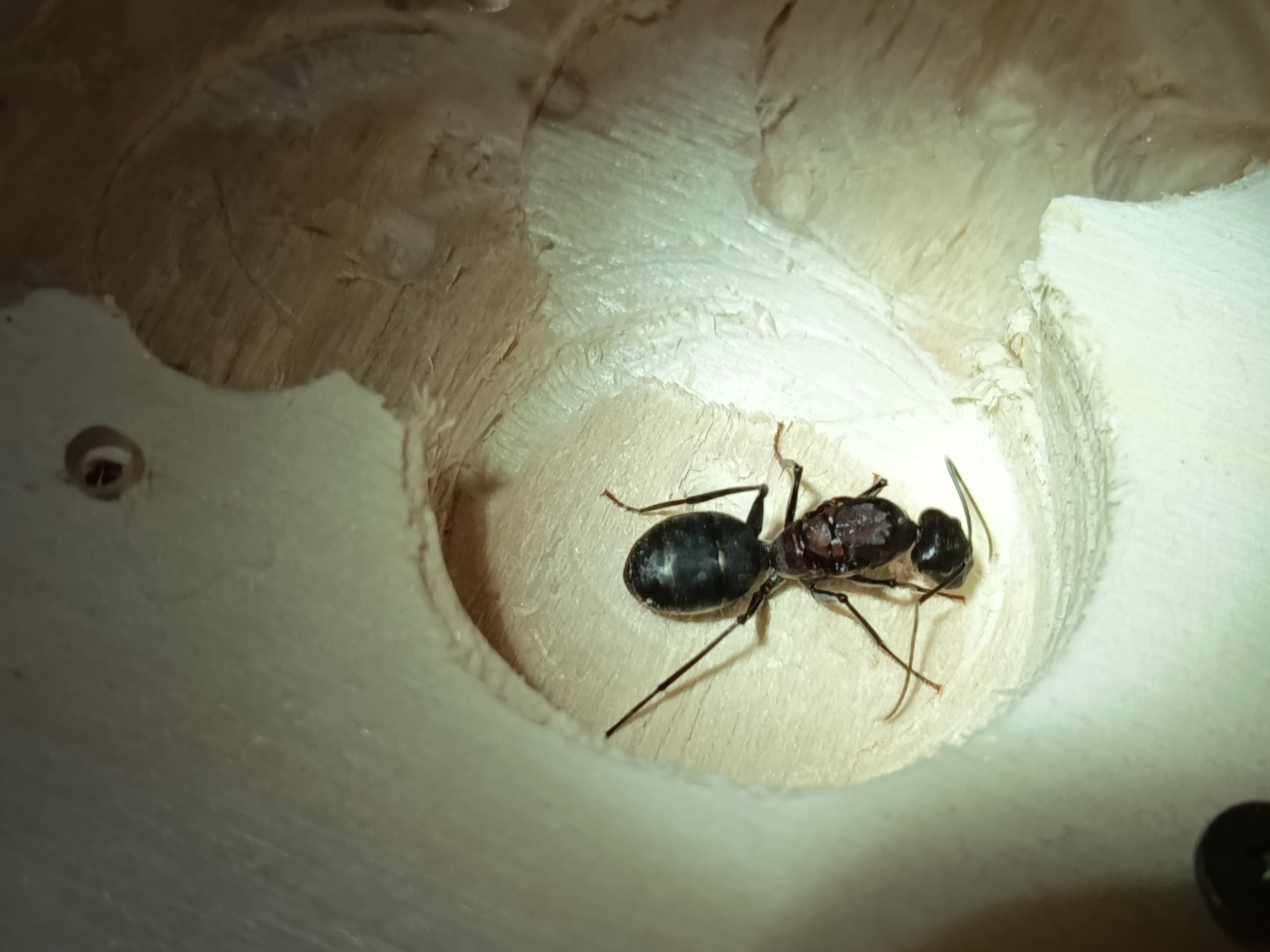 gestern gab es eine Überraschung. Beim Staubputzen habe ich versehentlich die Abdeckung des Nests zur Seite gestossen. Nachdem sie nicht mehr versorgt wird, hat die Königin sich selber auf die Reise gemacht und ist ins Nest umgezogen. Da ist es viel trockener, aber sie hat dort Zugang zu Wasser und Invertzucker. Ich habe die RG schnell neu aufgesetzt. Sie scheint es trockener zu mögen. Das Nest dürfte völlig trocken sein.