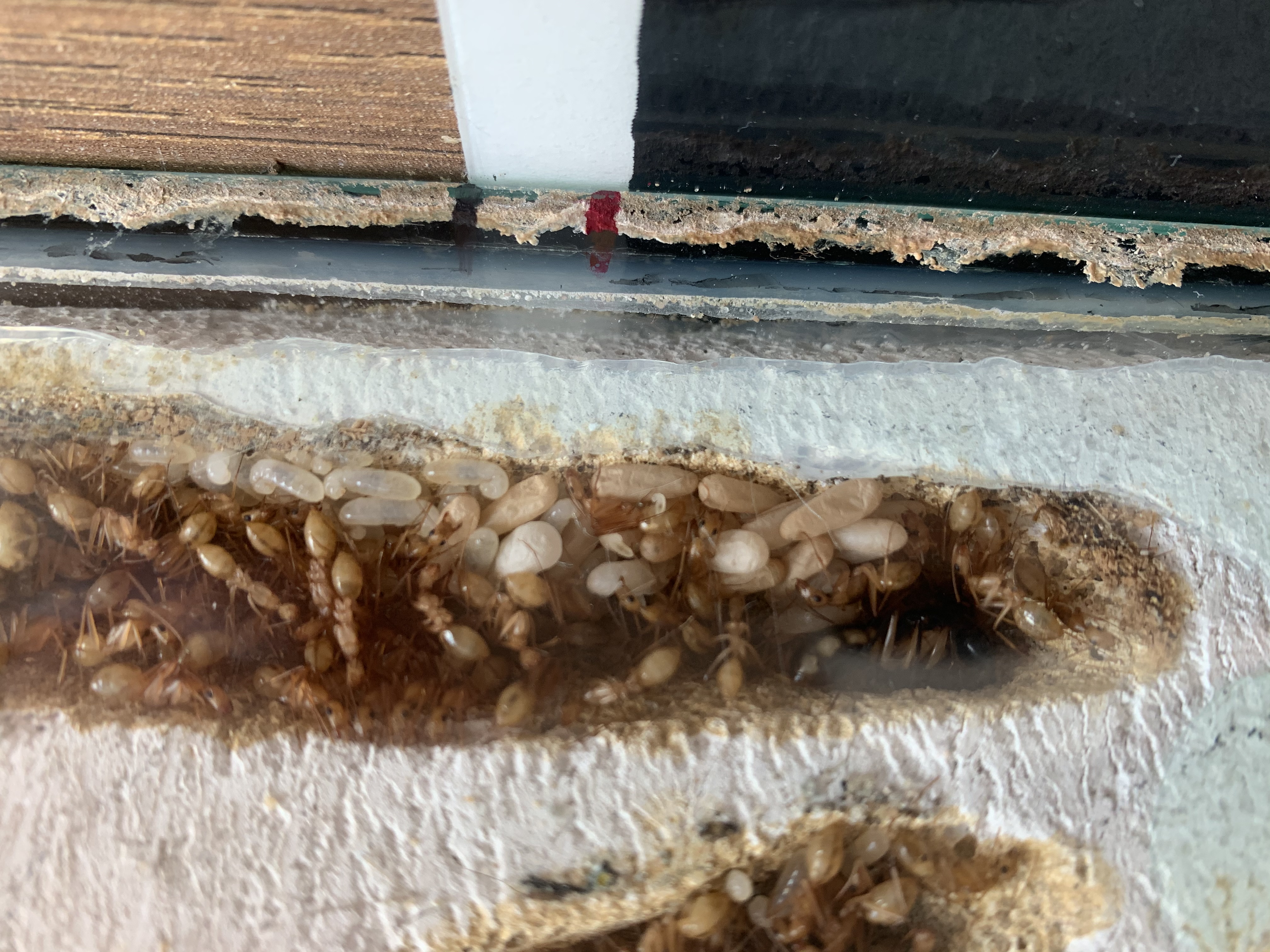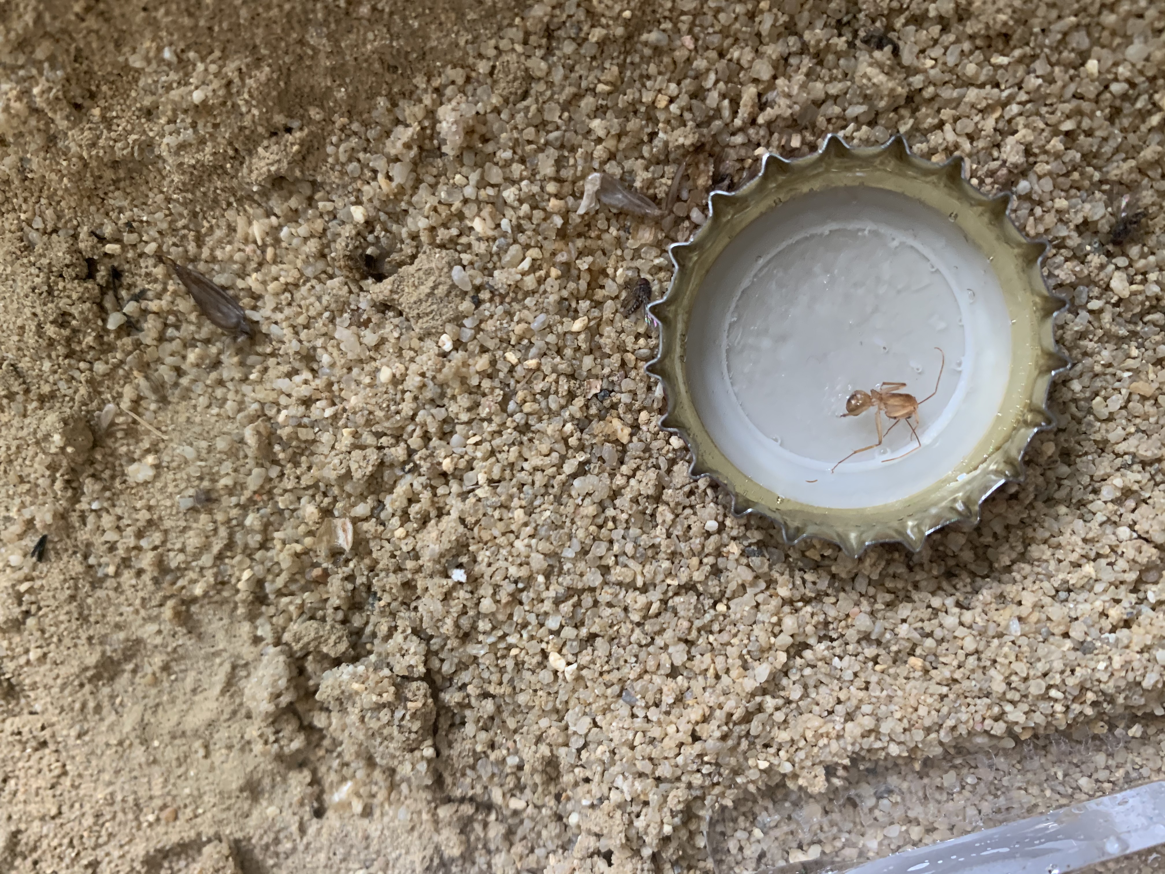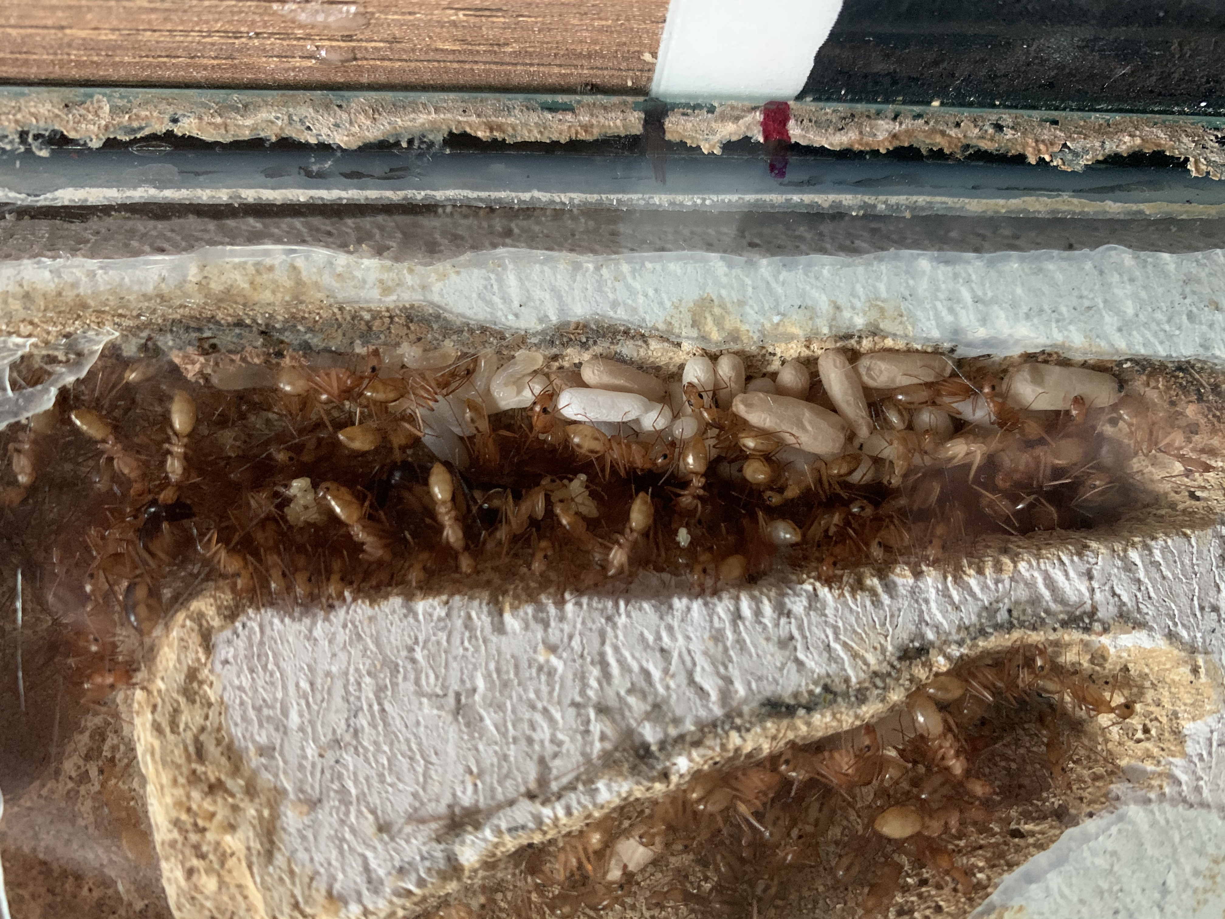 Eine noch tolle neue Information ist, dass sie in die rechte Seite des Nestes eingezogen sind. Davor waren nur 1-2 Ameisen in dem Teil des Nestes. Mittlerweile sind dort ein paar mehr. Die Futtertiere liegen da auch dabei.