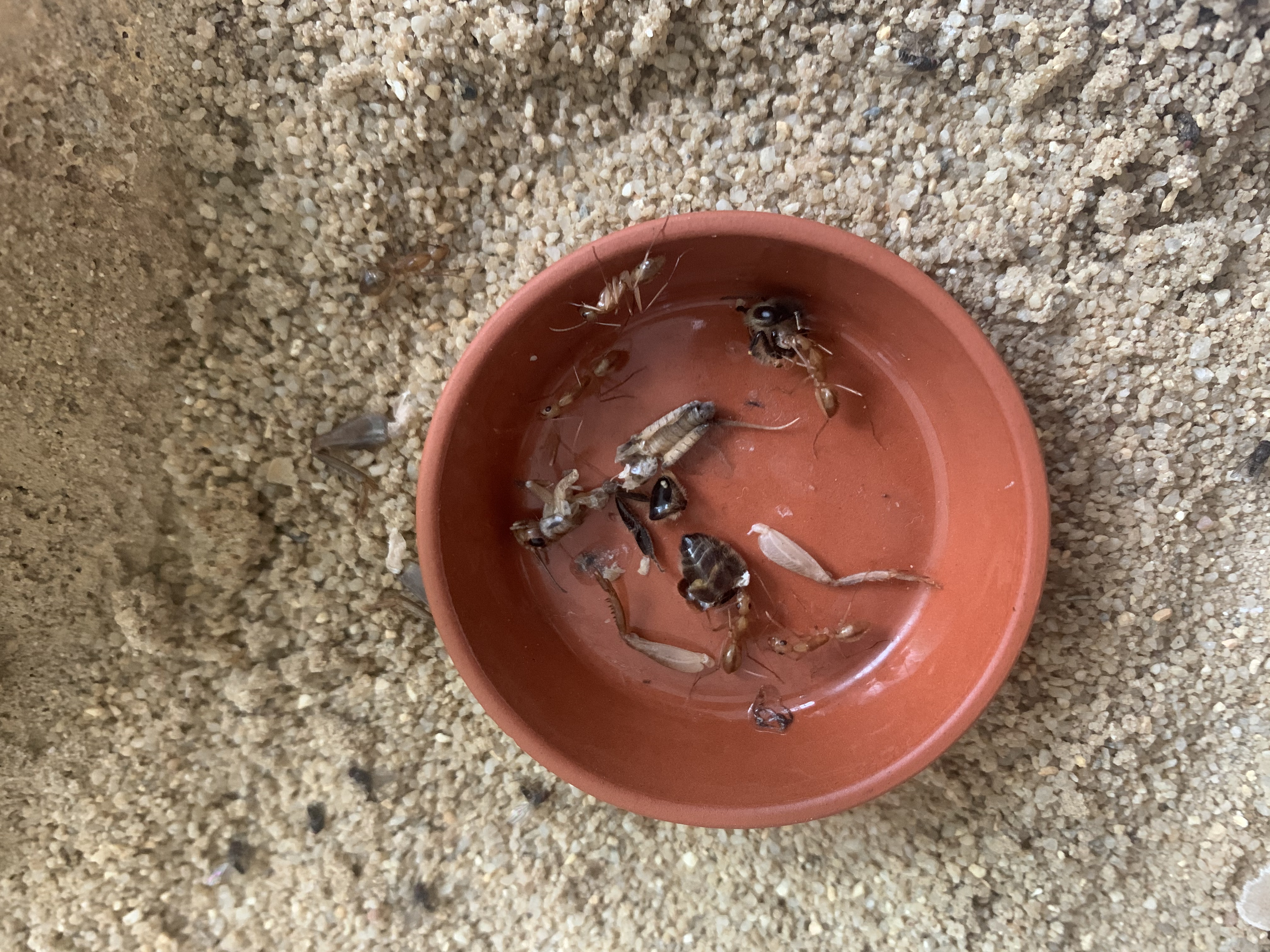 Ich habe heute ein kleines Experiment gestartet. Normalerweise legte ich die Futtertiere erst 18:30 in das Becken. Der Grund dafür ist, das die Ameisen meist erst 19 Uhr aktiv werden. —> Frische Futtertiere. Heute habe ich 15 Uhr das Futter angeboten, als ich 10 Minuten später geschaut habe, waren 2 Arbeiterinnen in der Schale. Kurze Zeit später waren es schon 10. Ich schlussfolgere aus dem Verhalten. a) Das sie entweder durch die steigende Kolonie Größe aktiver und zutraulicher werden. Oder b) Wegen dem schlechten und dunklen Wetter kamen sie eher aus dem Nest.