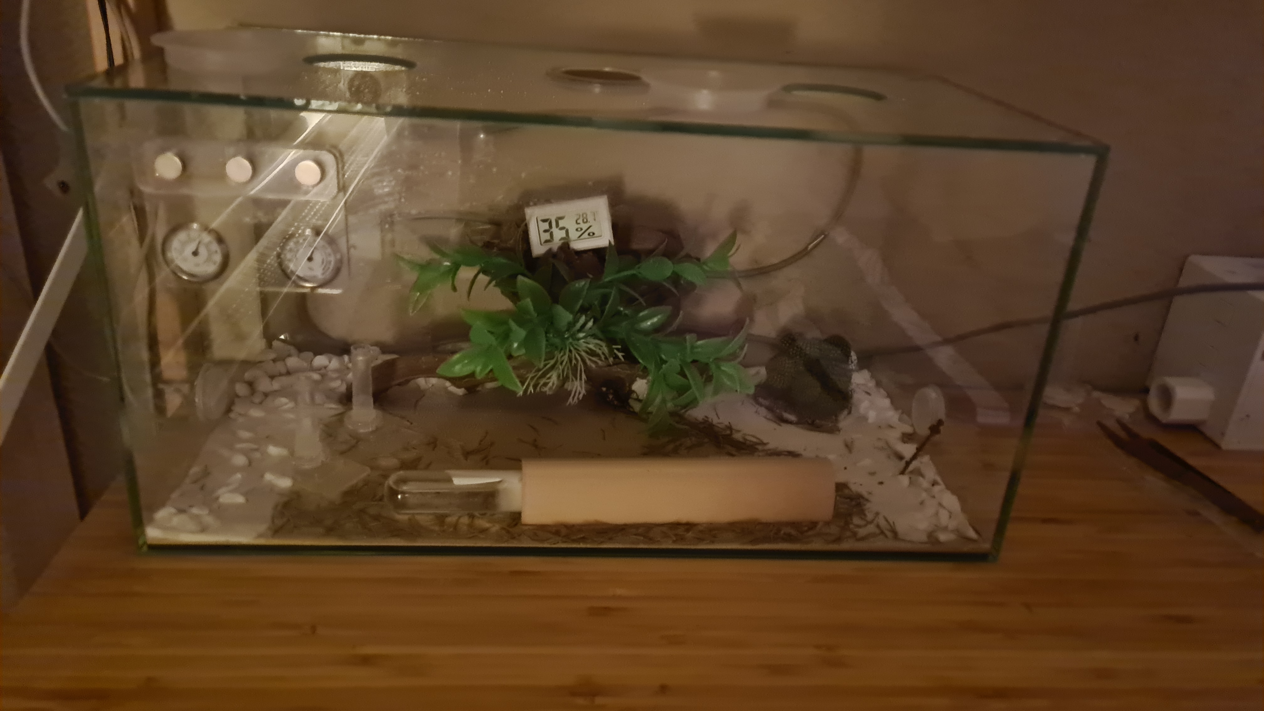 Ok also lass ich sie jetzt einfach mal in Ruhe. Sind mitlerweile 28 gradi. Formicarium. Aber eher hinten oben als unten vorn. Siehe Bild.