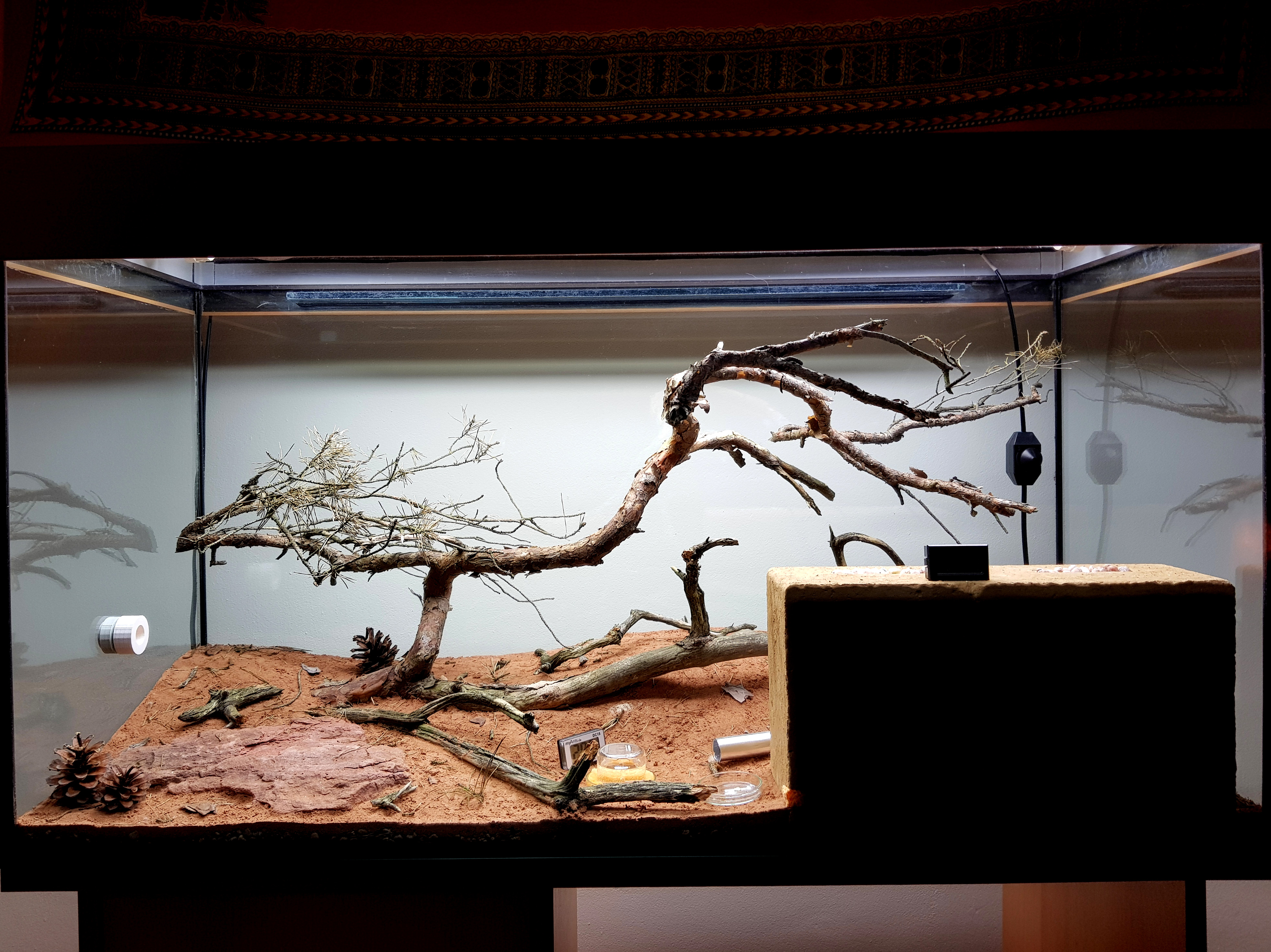Beim Nest habe ich mich für ein einfaches Ytong-Nest entschieden, welches ich mit Lehm bestrichen habe. Unter dem Nest befindet sich eine regelbare 7W Heizmatte und ein Thermometer mit Sensor ermöglicht es mir, die richtige Temperatur einzustellen. Fürs Erste ist es geschlossen.
