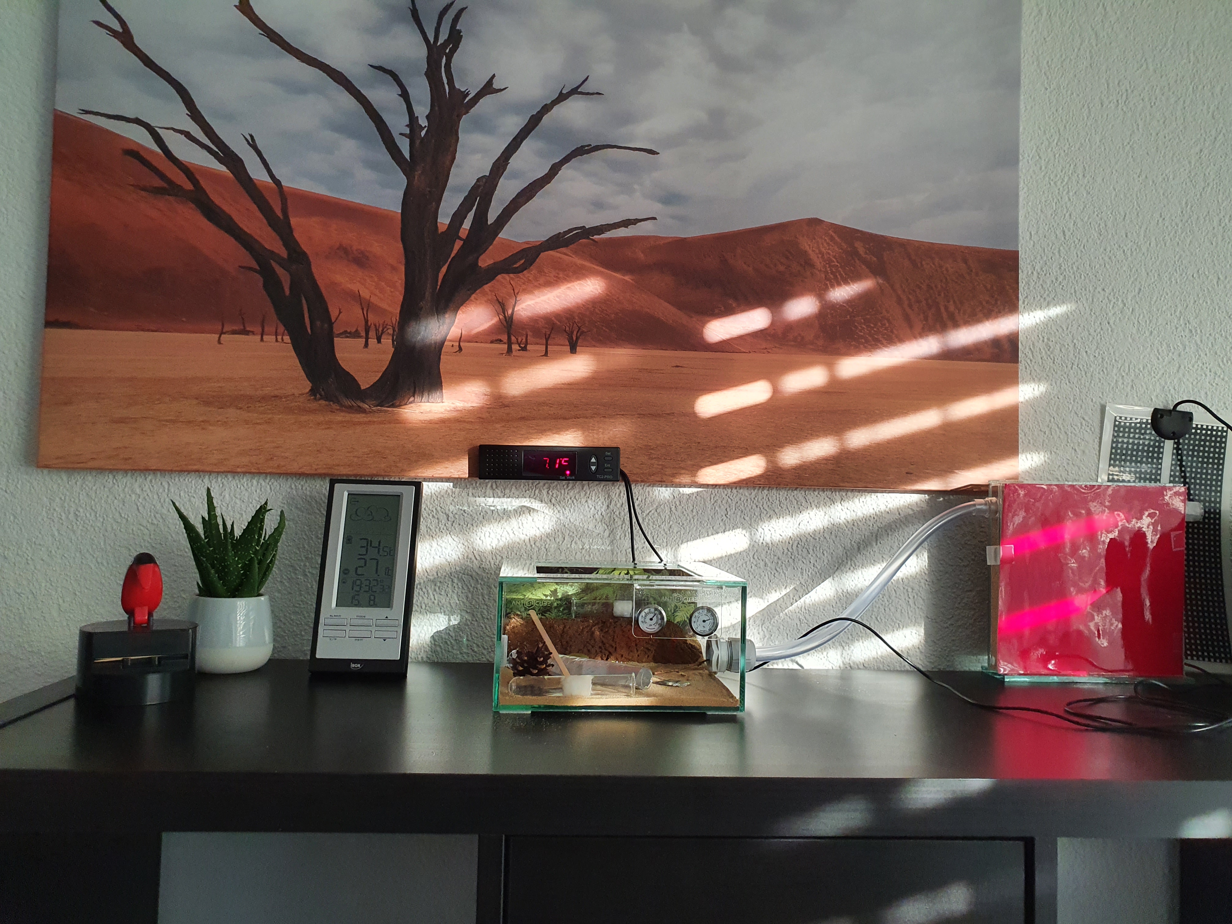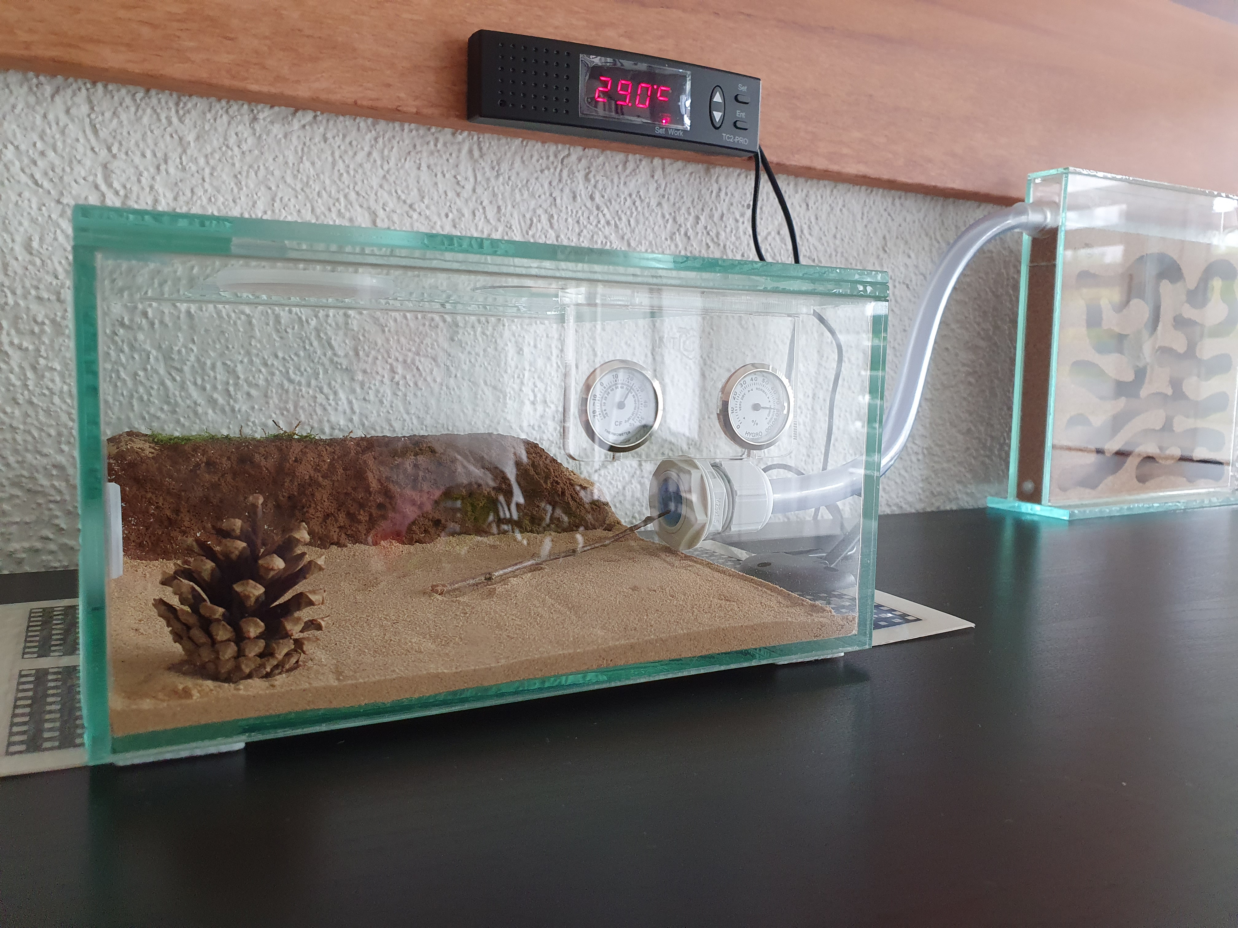 Ich bestellte mir in einem Ameisenshop ein Starter Kit. Arena + Nest mit Korkeinstatz, Heizmatte für die kälteren Jahreszeiten und ein Regelgerät für die Heizmatte. Als die bestellte Ware ankam baute ich die Sachen auf. Bevor ich die Ameisen erhalte wollte ich erst mal schauen wohin ich es stelle wie es sich mit den Temperaturen verhält etc. Mir als Schweizer kam das Ganze zu Flach vor, also ab in den Baumarkt, Ytong Stein kaufen, bearbeiten und reingestellt. Oben auf dem Ytong Stein habe ich eine Mulde gemacht und Moos eingepflanzt (mal Schauen wie lange sich das Moos hält). Ein Tannzapfen musste auch noch herhalten als Deko/Klettermöglichkeit. Als ich zufrieden war mit der Arena, Standort etc. Bestellte ich mir die nicos. Ankunft der Ameisen