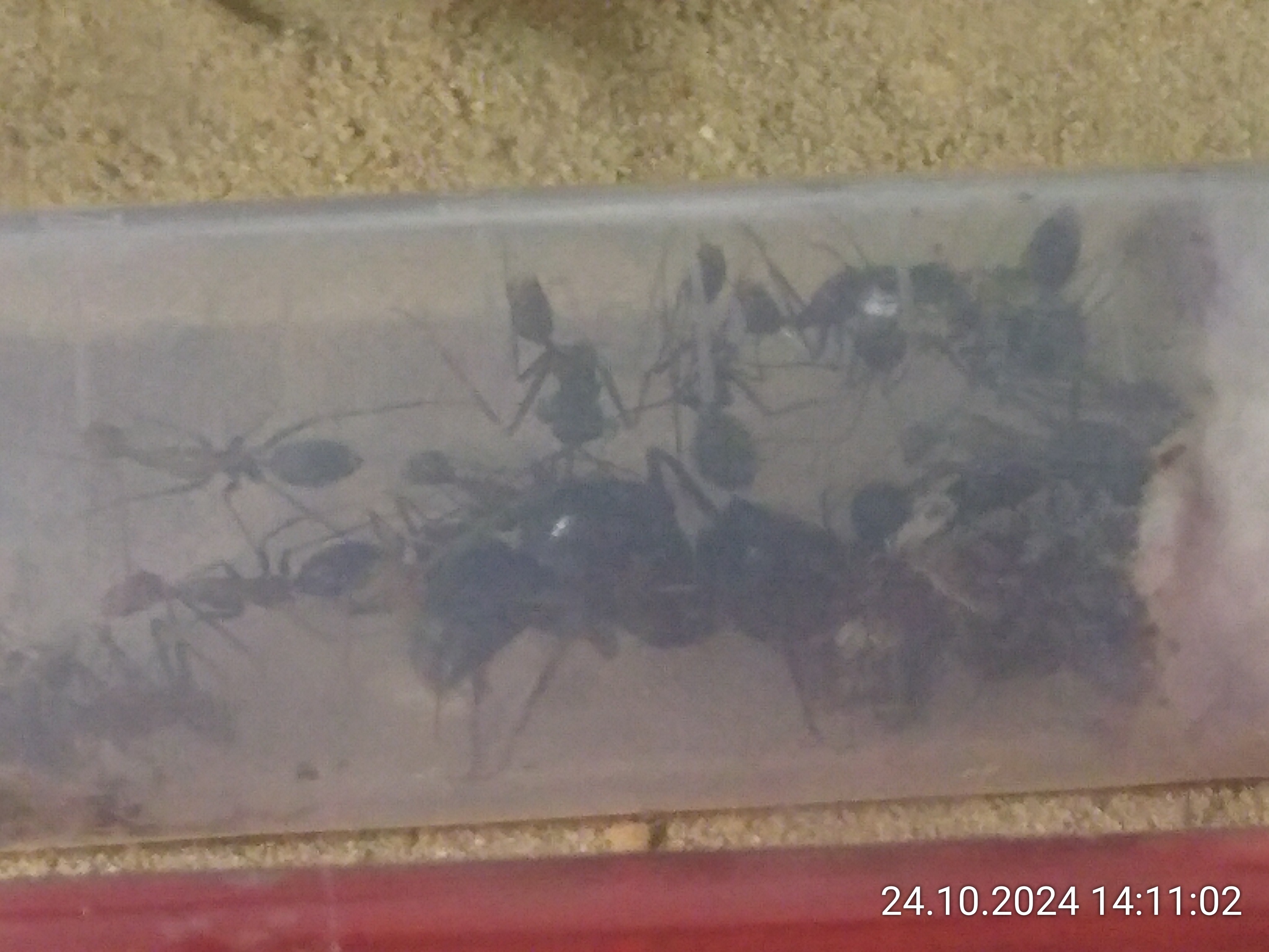 Eigentlich wollte ich ihr RG erstmal nur in ihre kleine neue Arena legen und abwarten, aber weil sie schön warm war, habe ich es auch direkt geöffnet. Und dann war Hoffen angesagt. Aber es hat nicht lange gedauert und es kam Bewegung in die kleine Kolonie. Nach wenigen Minuten waren alle aktiv. Bis auf eine, die es nicht geschafft hat.