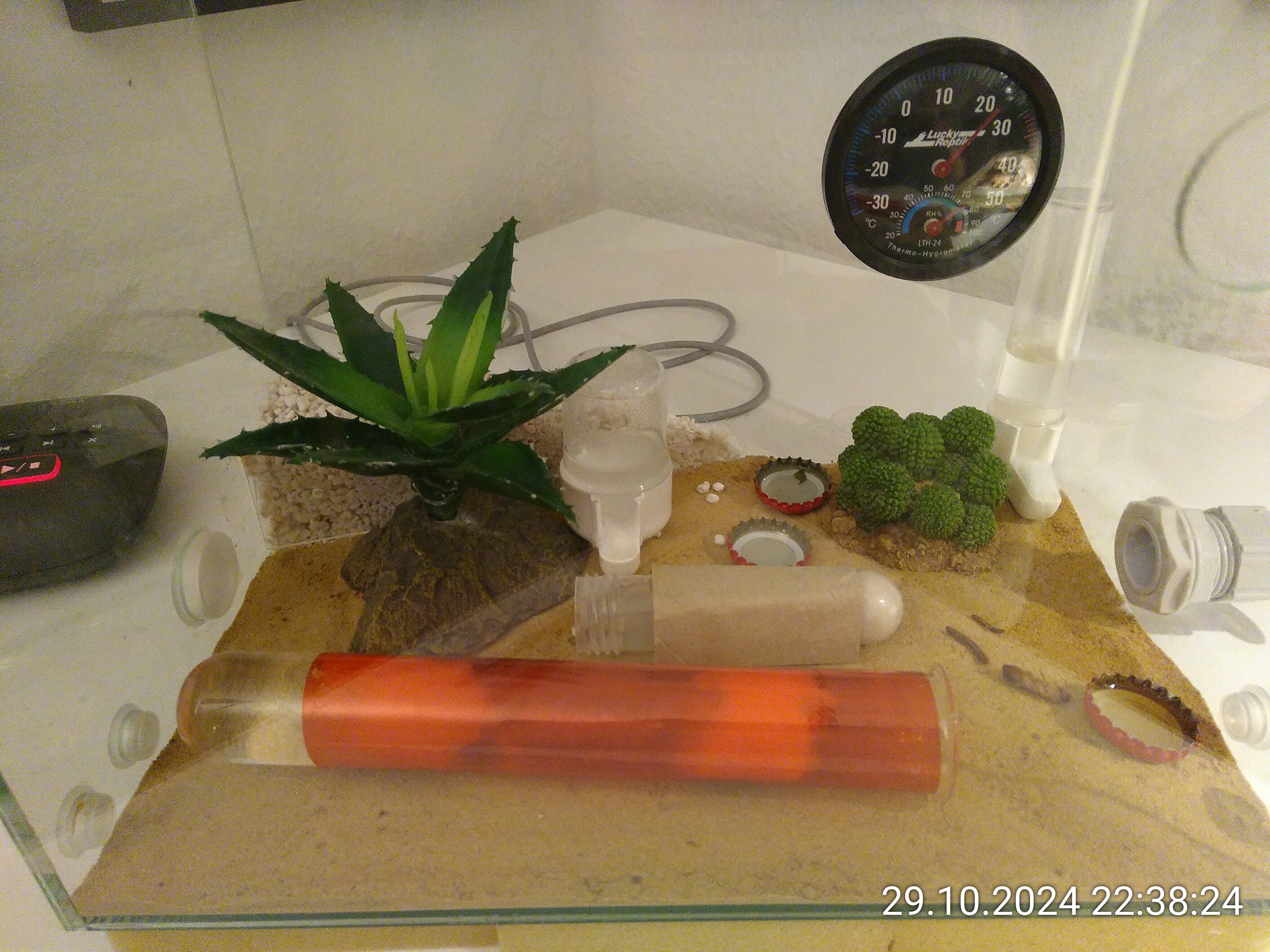 Ihre neue kleine Welt, von unten leicht beheizt auf ca. 25 °C. Die weißen Steinchen sind Perlite (oder so ähnlich) und dienen mir als Wasserspeicher, ihnen evtl. als Baumaterial. Dadurch liegt die LF in der Arena bei 65 - 70 %. In das Riesen-RG habe ich vorne noch einen Wattestopfen um ein kurzes Stück Plastikschlauch gelegt und den Eingang so verkleinert. Der Durchgang sollte auch für die