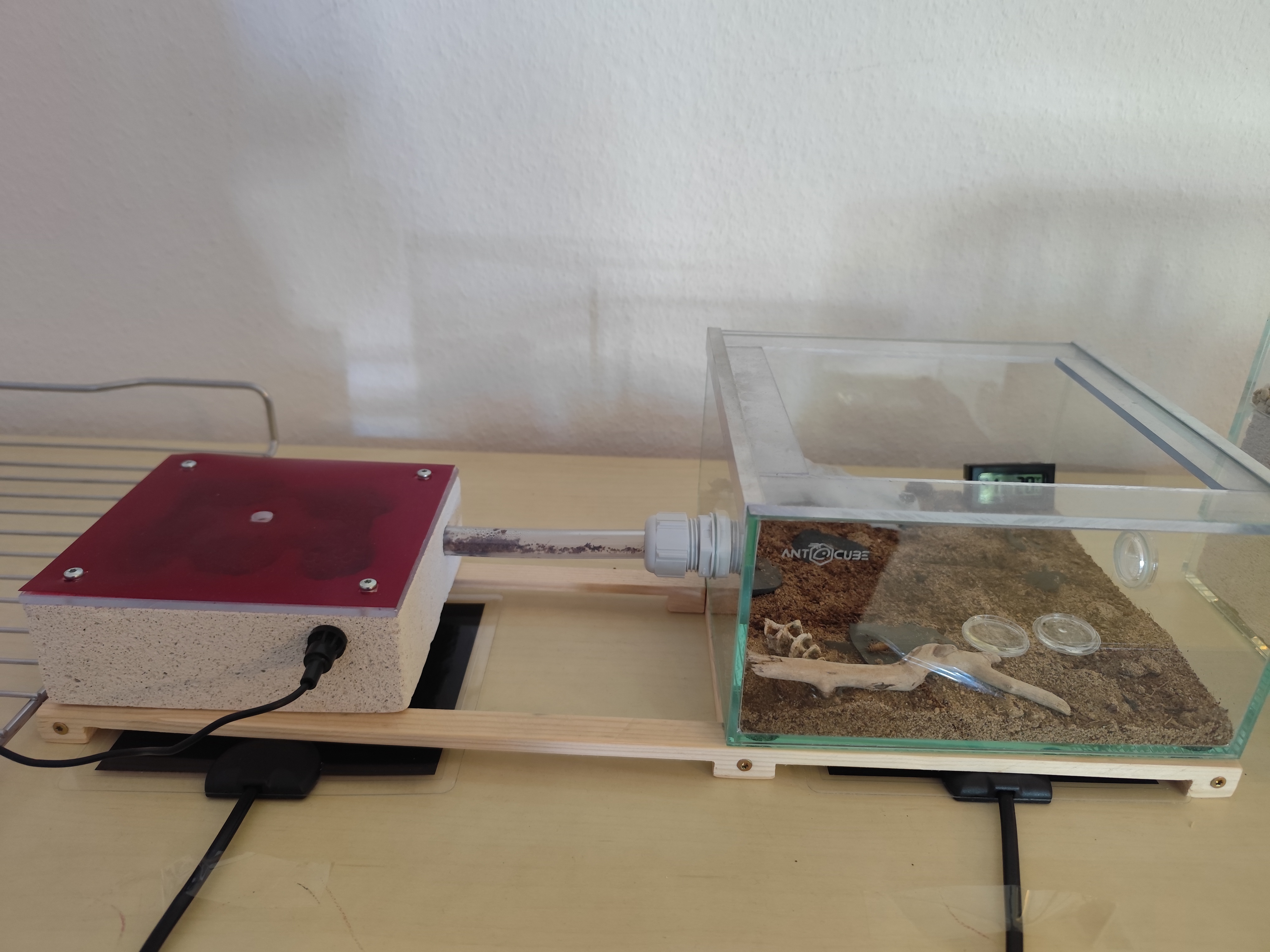 Dadurch sind nun beide Teile (Arena und Nest) auf der selben höhe > sieht cooler aus, Arena kann auch beheizt werden (durch Heizmatte (das mit der Wärmelampe ist noch in Arbeit)) und der Schlauch konnte gekürzt werden.