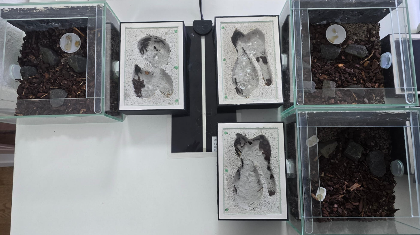 Wichtig zu erwähnen: Durch die Abnahme der Abdeckungen der 3 Nester sind die Ameisen an die Wandung der Nestkammern gedrückt.