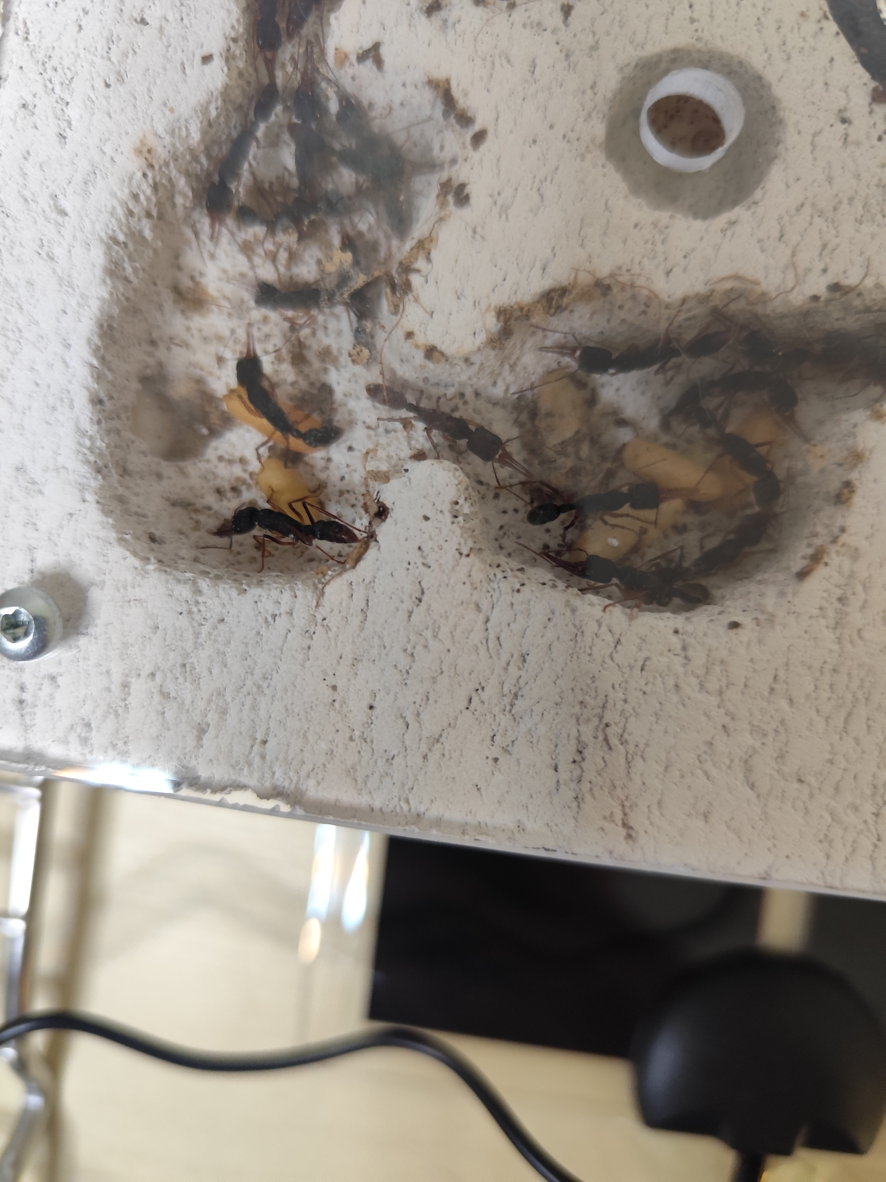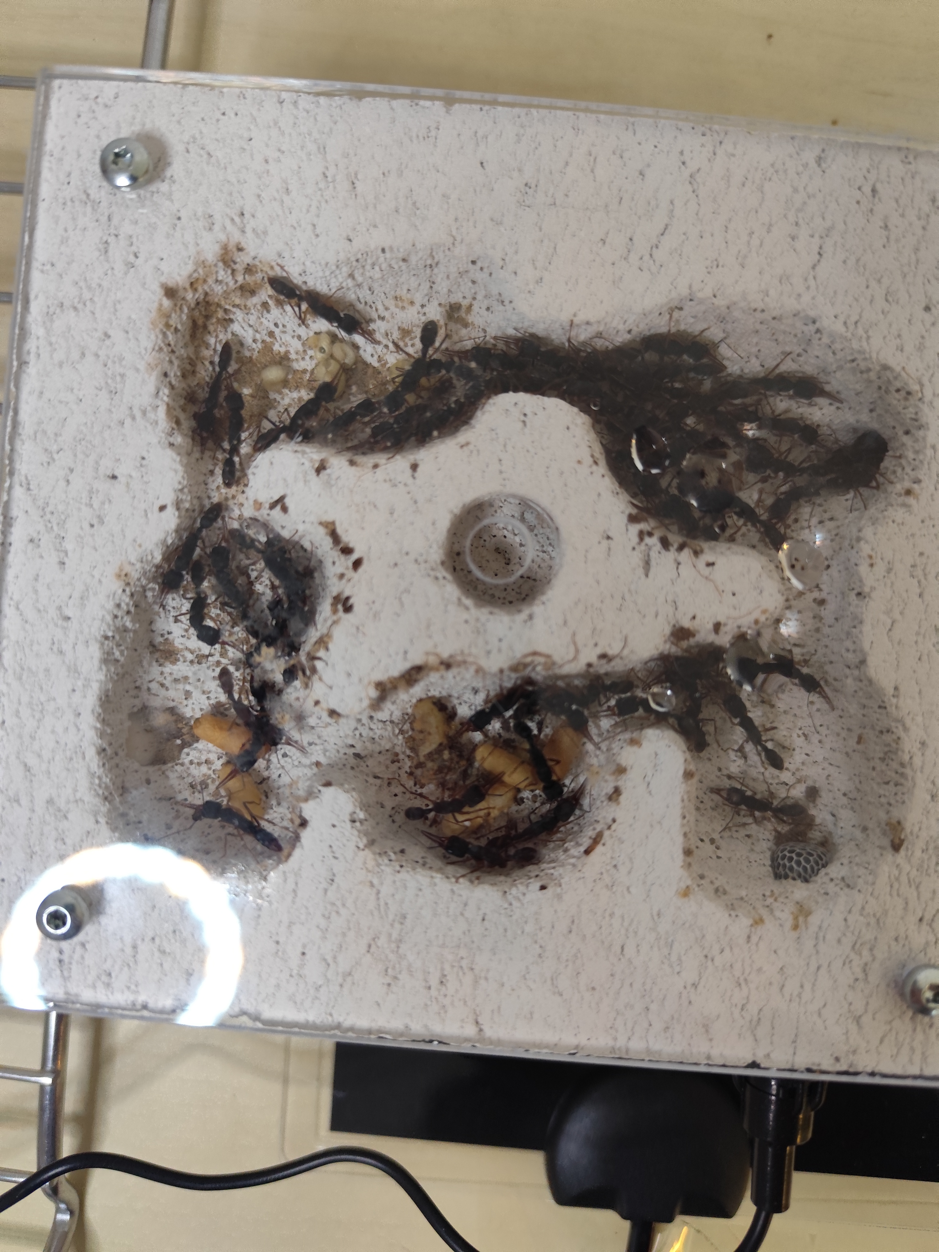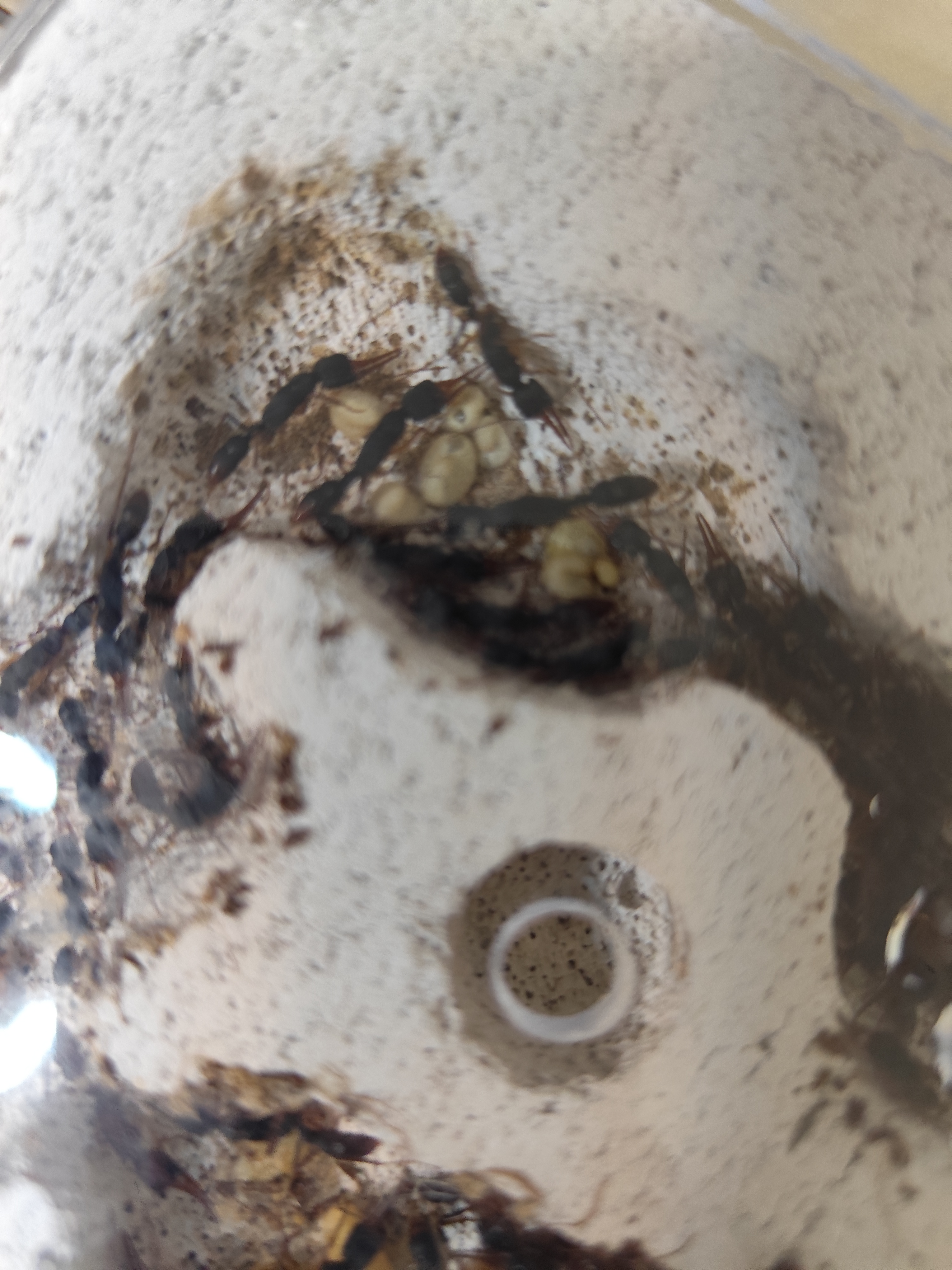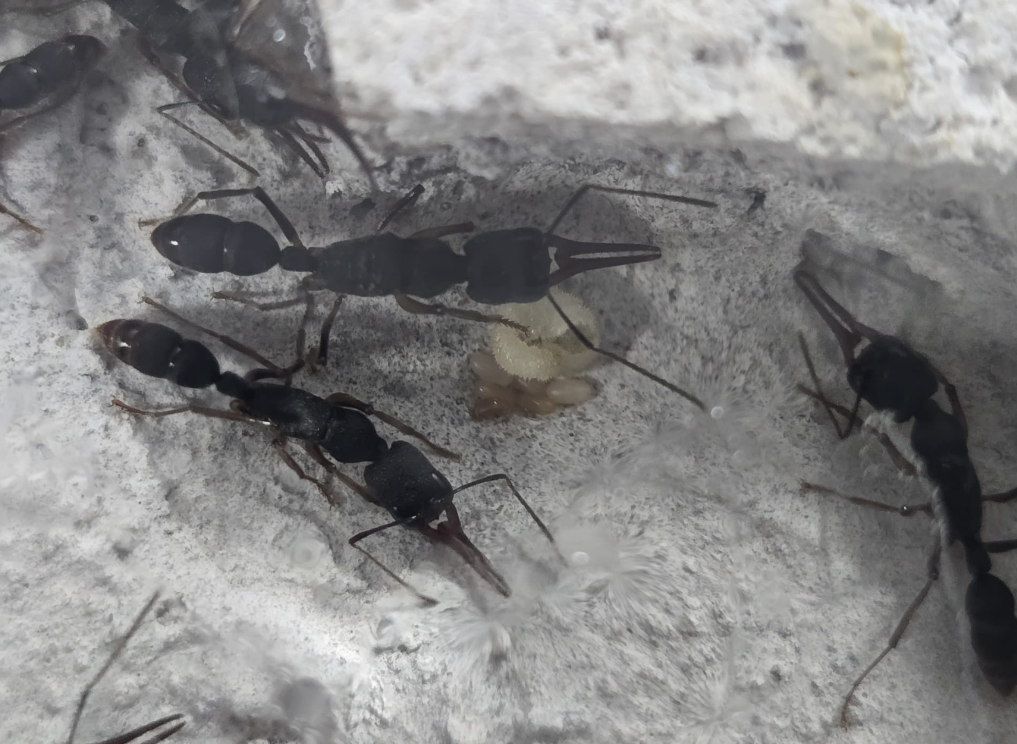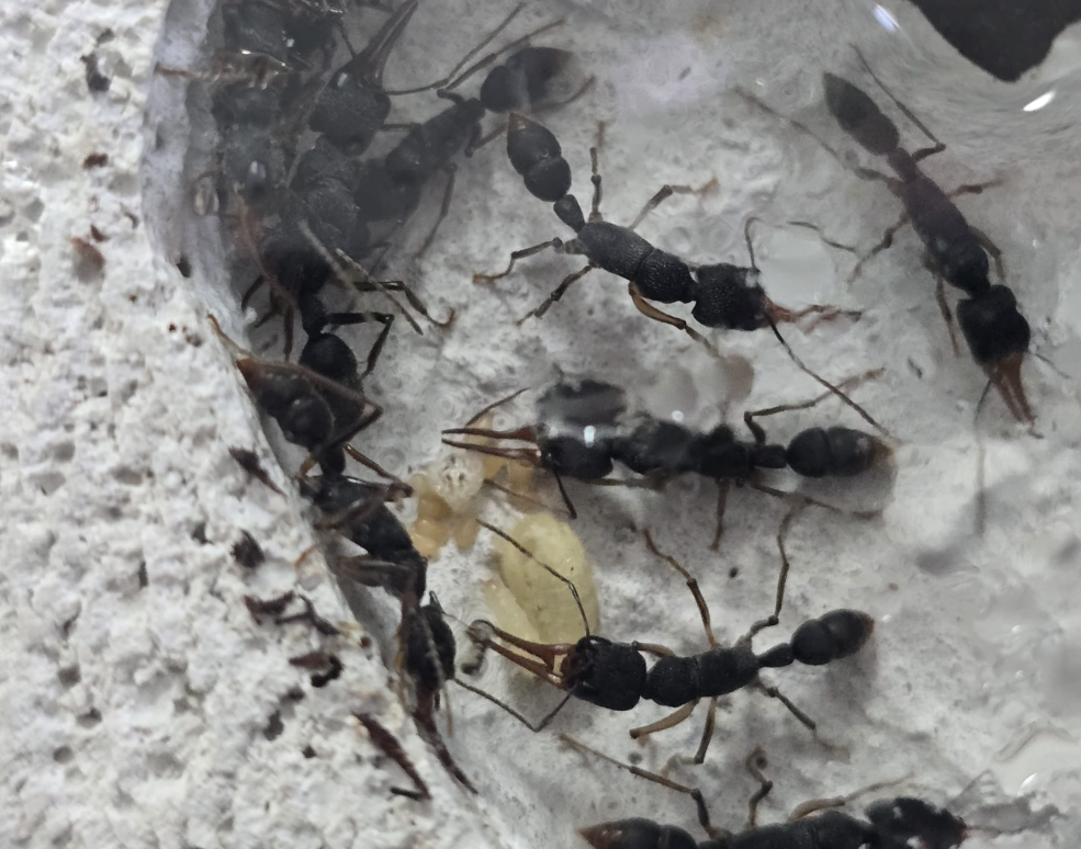 Ich weiß, eine tote Arbeiterin hat nichts zu bedeuten, aber irgendwie fressen sie auch nichts... Seit ihrer Ankunft haben sie keine Proteine ins Nest gebracht (sie haben jetzt schon 2 Heimchen bekommen und erlegt doch wie schon erwähnt wird dieses nur in der Arena herumgetragen)... Auch am Wasser oder Abgabendicksaft habe ich sie noch nicht gesehen...