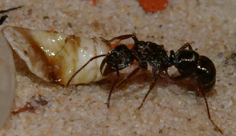 Desweiteren wäre die Geschichte mit dem weißen Ei geklärt. Ectatomma ruidum legt weiße Eier, die dann kurz darauf dunkel, fast schwarz werden. Warum das so ist, weis ich nicht. Würde mich aber echtmal interessieren. Vielleicht einfach nur eine chemische Reaktion eventuell zur Tarnung in der Erde. Weil weiße Eier auf brauner Erde sind schon deutlich sichtbarer. Aber welche natürliche Feind könnte da dahinter stecken? Die gekrümmte Haltung nimmt Emma auch nur zum Eierlegen ein. Sie nimmt dann direkt das Ei in die Mandiblen und legt es ab.
