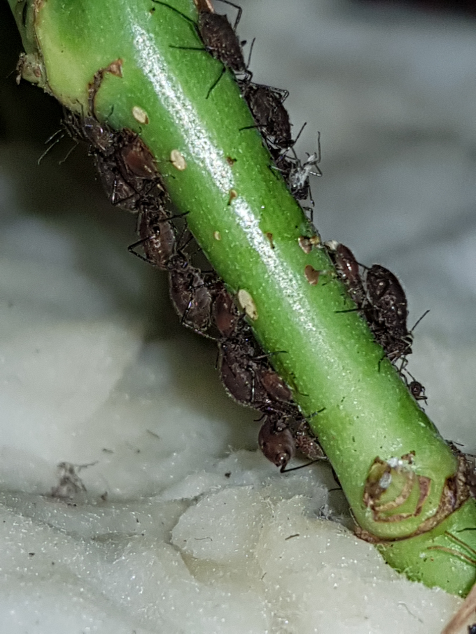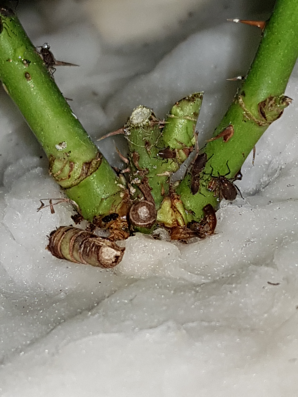 M. submacula dagegen ist ein wenig tricky: Erst einmal sind sie lange nicht so hĂ€ufig wie die GroĂe Rosenlaus und durch ihre Lebensweise auch nicht sichtbar. Mein Tipp wĂ€re es, die Rose nicht nach den LĂ€usen sondern nach Ameisen abzusuchen. Wenn Ameisen vom Boden an der Sprossachse nach oben wandern, ist die Chance gut, dass BlattlĂ€use drauf sind. Man sucht jetzt nach Ansammlungen von Ameisen an den Sprossachsen (auch den verhölzerten Bereichen), und wenn M. submacula auf der Rose sind, werden sie dort sein. Diese LĂ€use werden Ă€hnlich von Ameisen belagert wie ihre eigenen