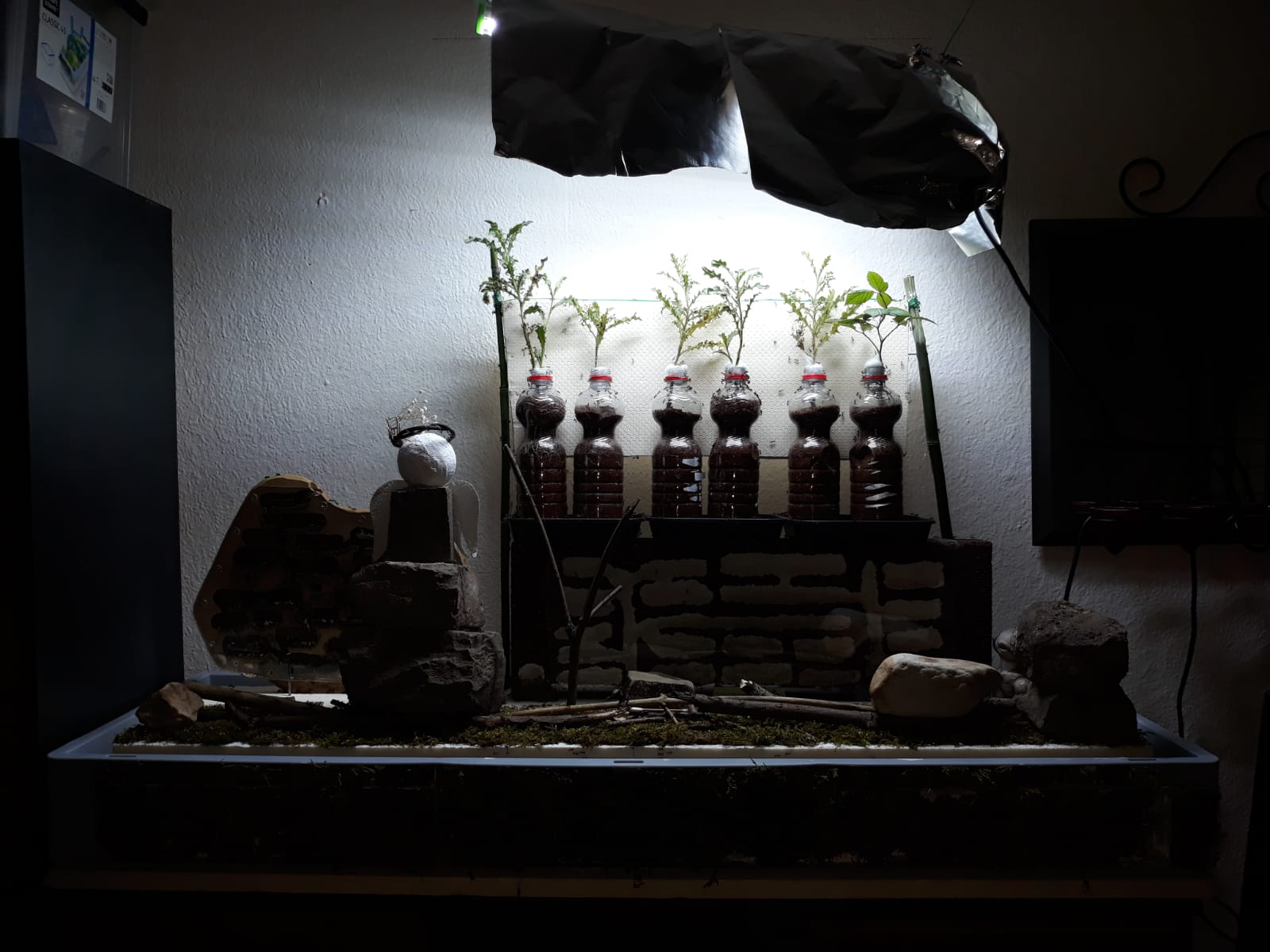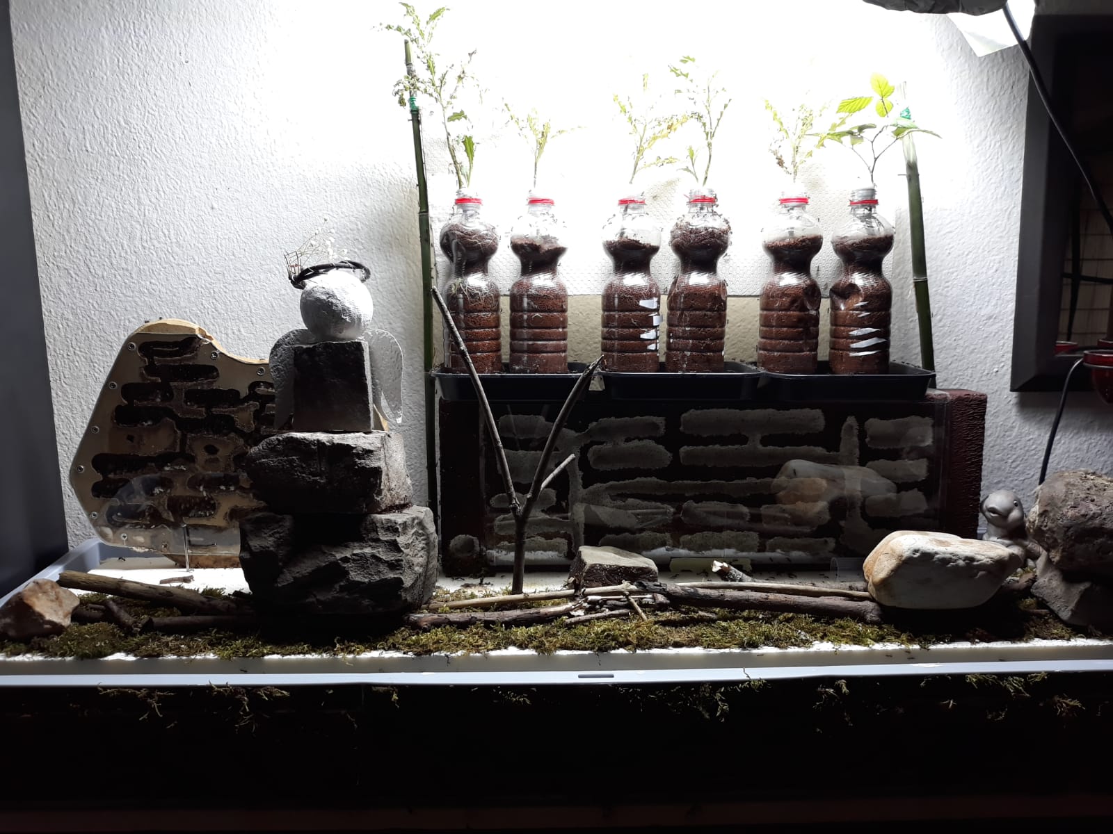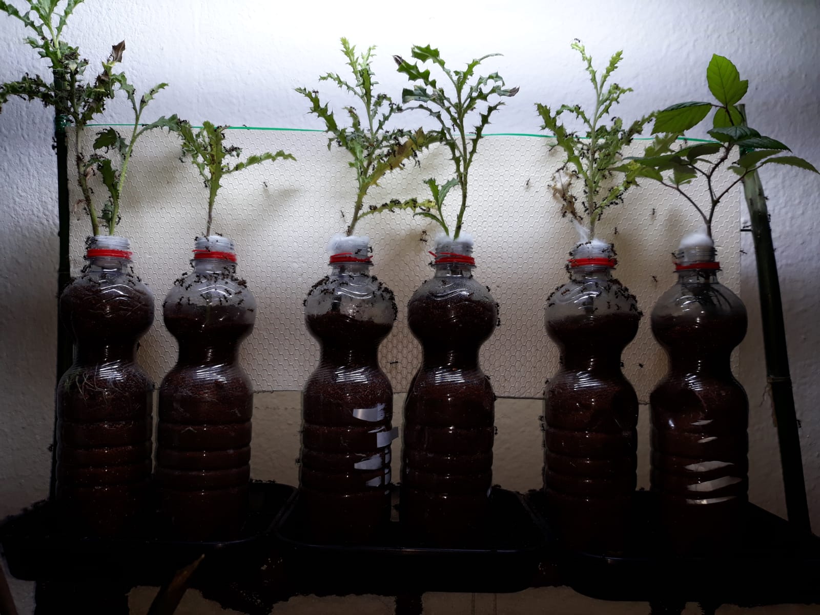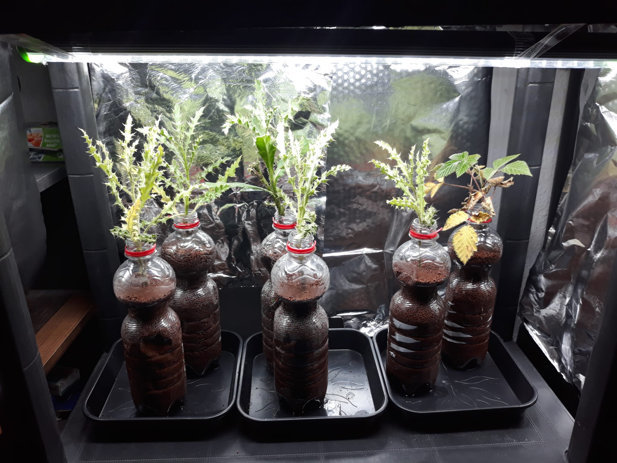 Hier sind 5 Disteln und eine Brombeere unter einem Growlight. Ich habe das in einem Regalfach gebaut, drei Seiten mit Alu Folie ausgekleidet damit das Licht besser reflektiert wird. Das Growlight wie auch das ganze Setup plane ich in spĂ€testens einem Monat auf die große Insel meiner Camponotus nicobarensis zu ĂŒbertragen. Die Pflanzen wachsen bisher wunderbar und haben ihre GrĂ¶ĂŸe fast verdoppelt. Bei der Brombeere rechts sieht man noch die abgeworfenen alten BlĂ€tter, und darĂŒber die frischen neuen Triebe.
