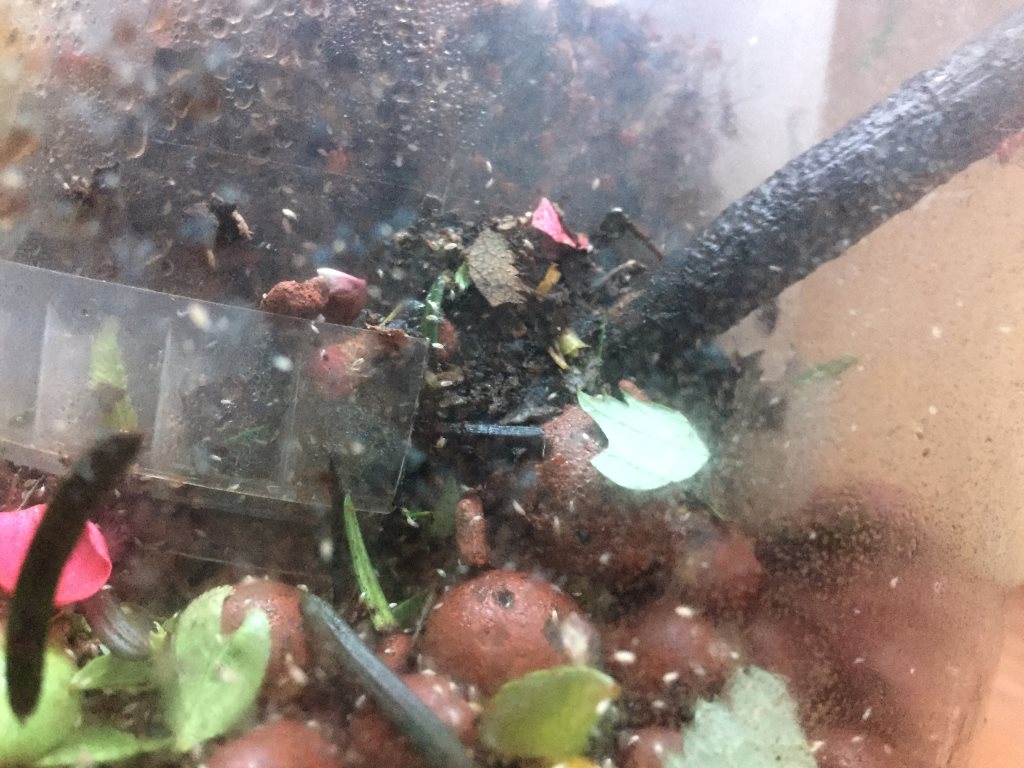 Hier hat sich auch ein Nachteil der Blähtonkugeln gezeigt: viele feuchte Hohlräume, welche einen super Lebensraum für Springschwänze darstellen. Zusammen mit den verrottenden Blättern + der hohen Luftfeuchtigkeit, war dies ein idealer Lebensraum für Springschwänze, die sich im Pilzbecken super vermehrt haben: