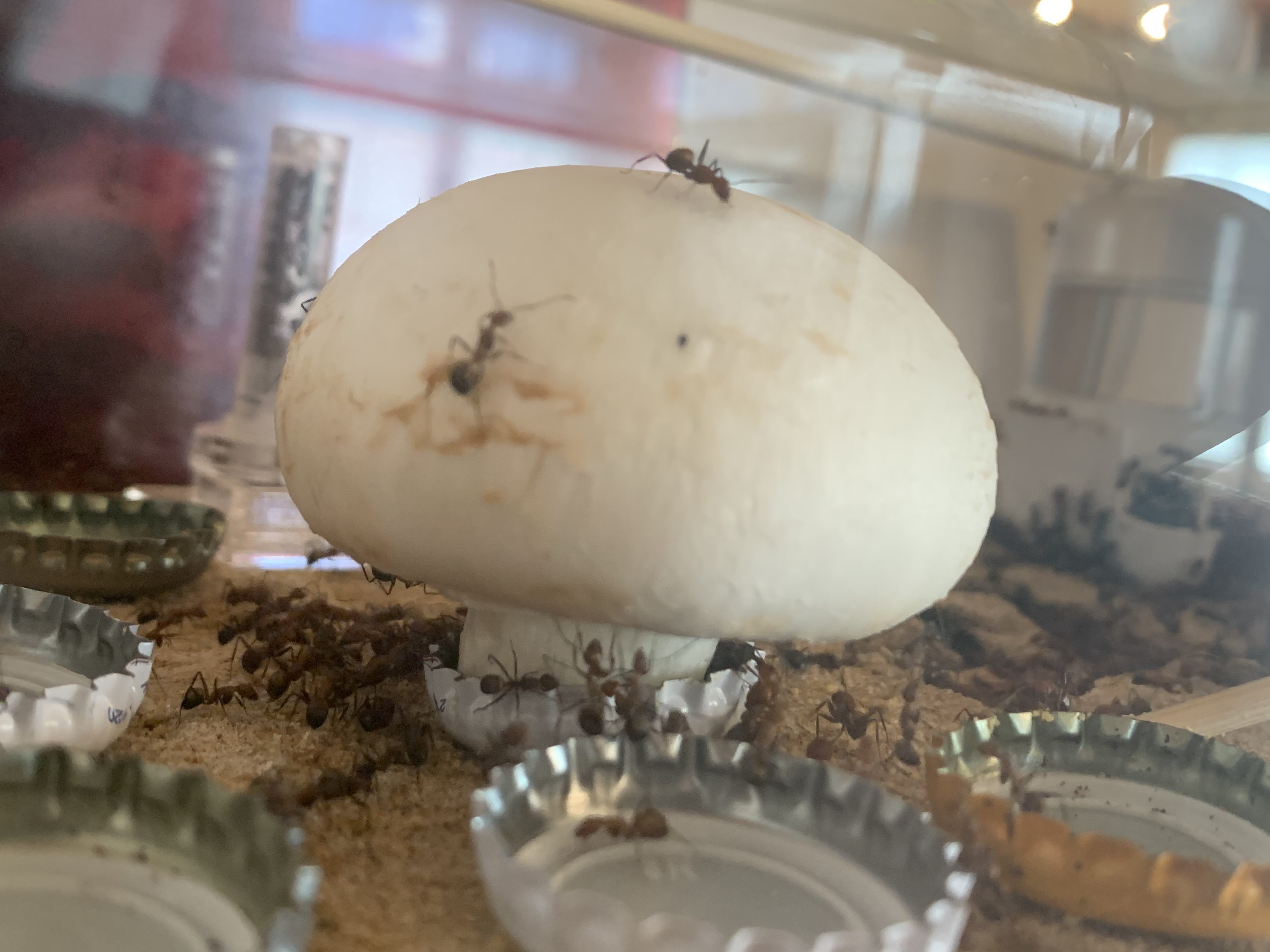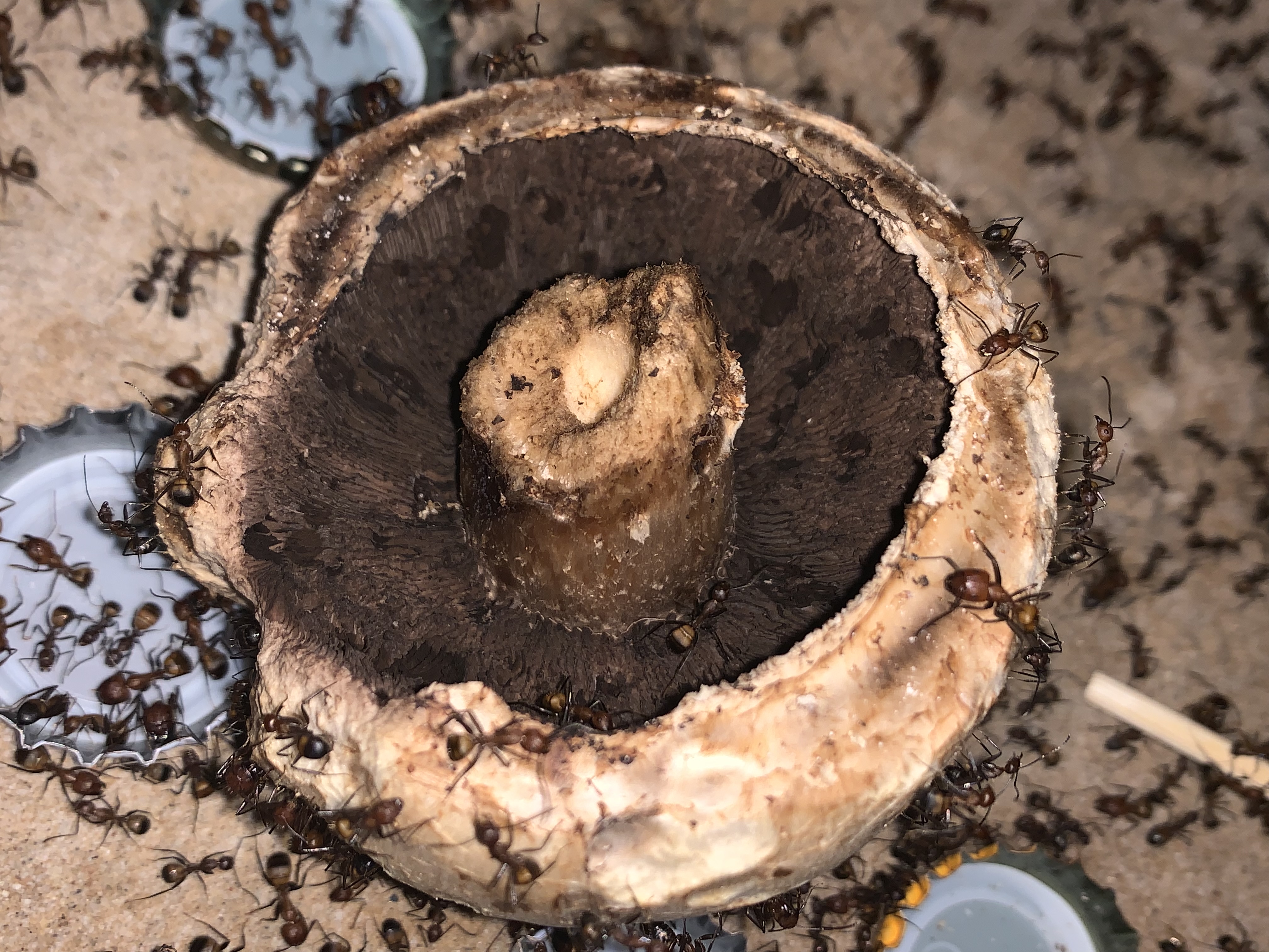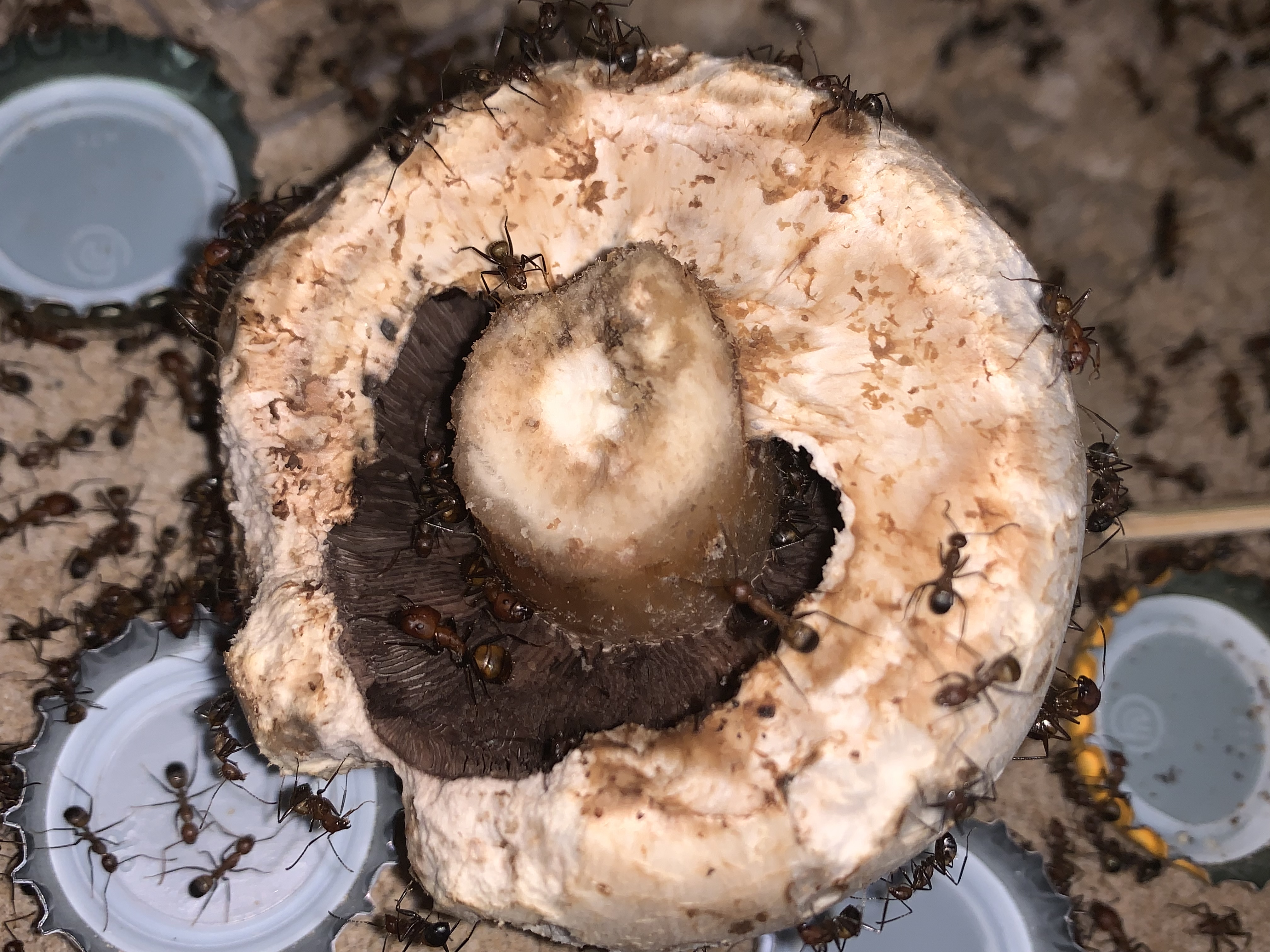Gestern Mittag habe ich meinen Camponotus nicobarensis einen ganzen Champignon-Pilz (einen von den groĂen) der ist jetzt natĂŒrlich noch nicht gefressen, aber meine Camponotus nicobarensis sind eifrig dabei.