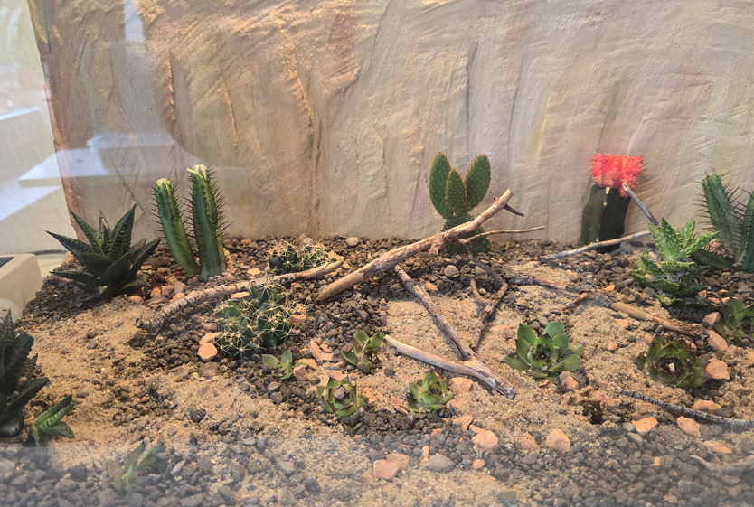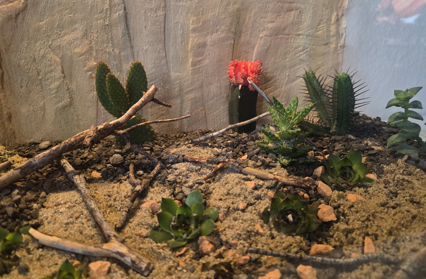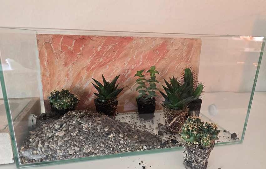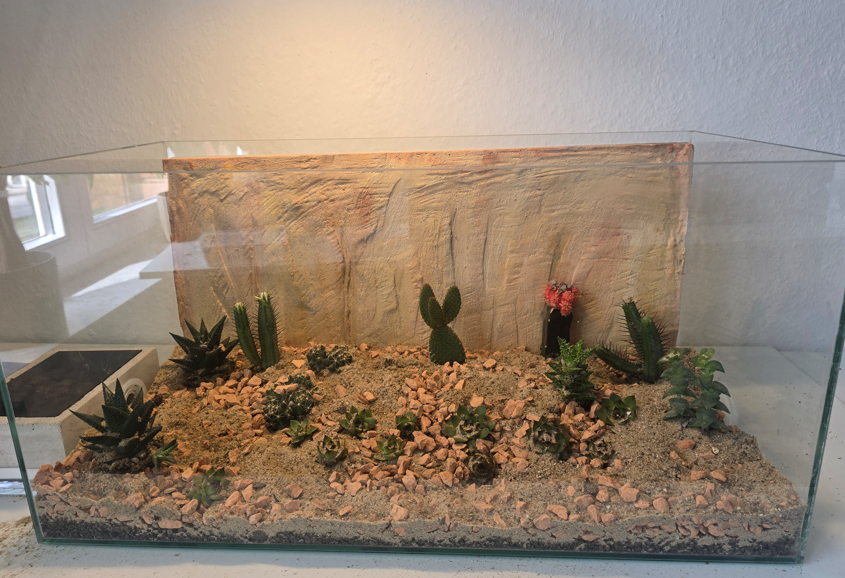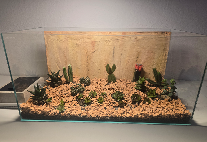 Das gilt nicht nur für das Granulat, beziehungsweise den Boden - sondern auch für die Pflanzen und Pflanzengröße. Am Ende machen Hölzer und Deko-Artikel im Hintergrund