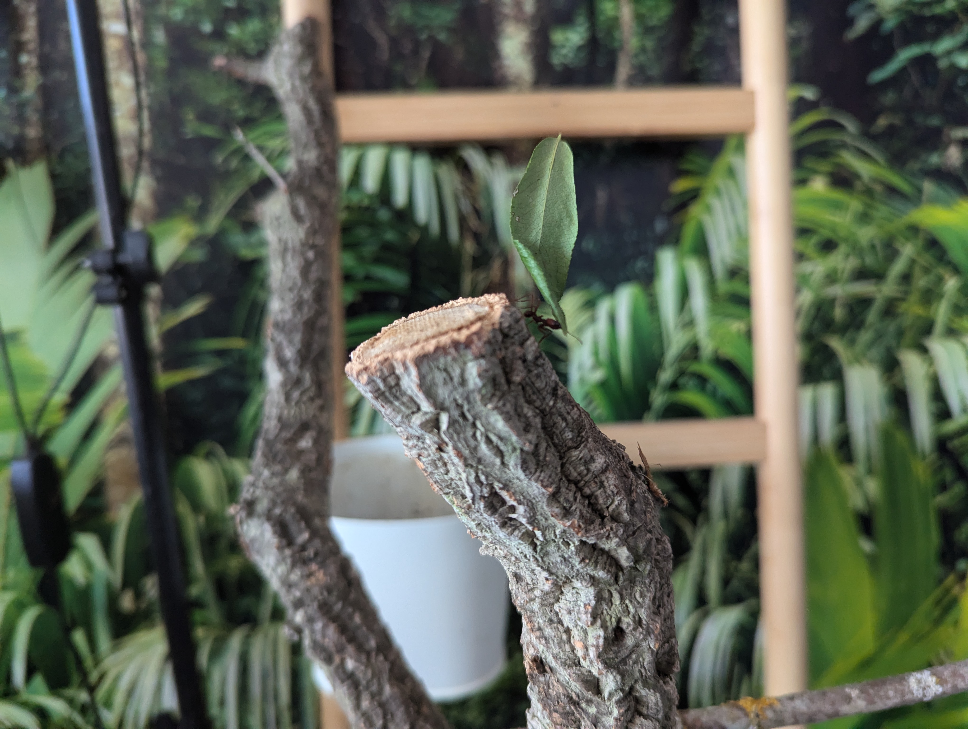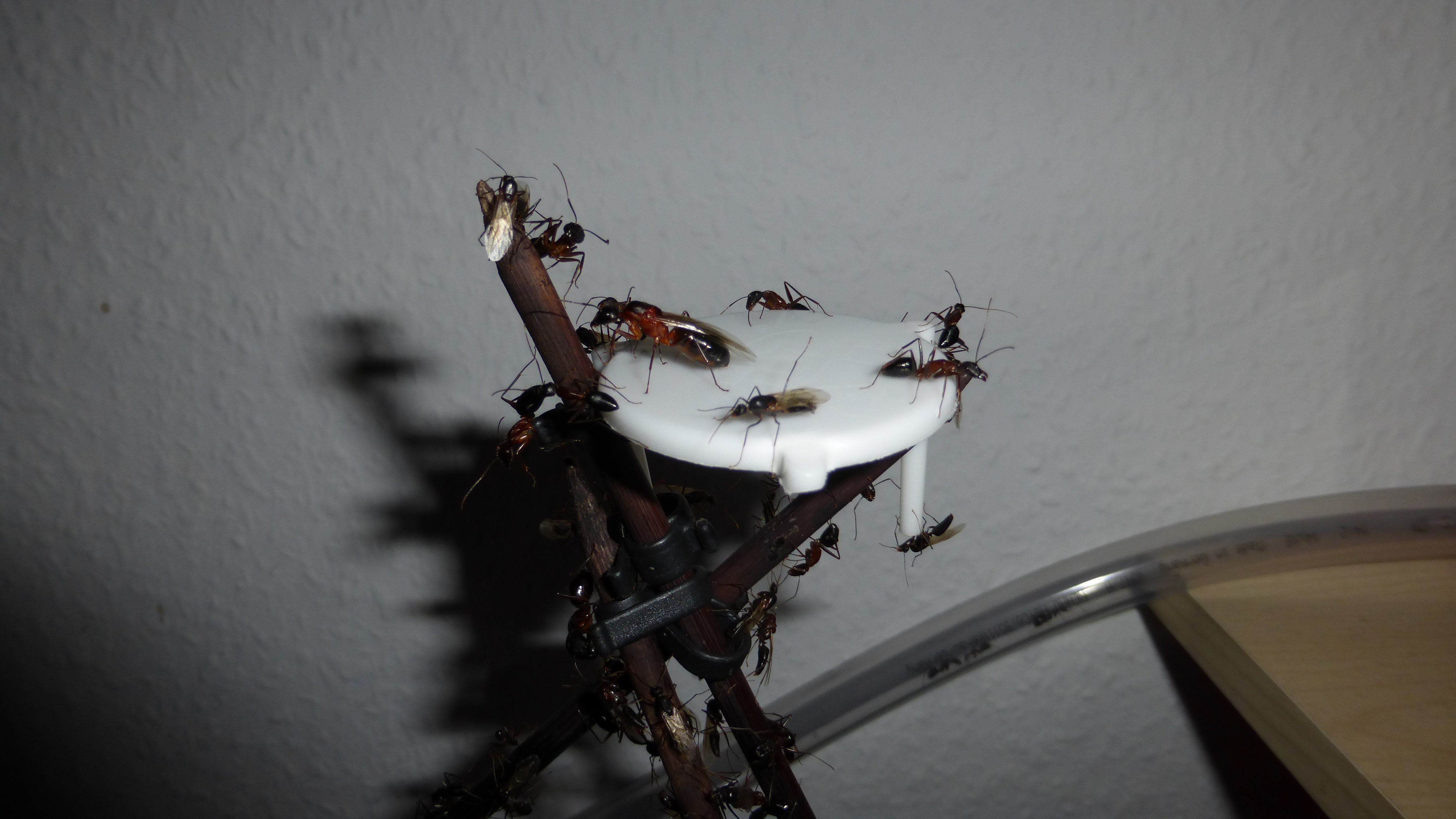Und eine Lasius niger nascht einen Tropfen Honigtau. Leider unscharf, aber das Foto fand ich trotzdem ganz nett:
