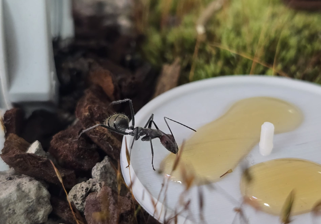 Hier eine junge Camponotus singularis Kolonie. Beziehungsweise, eine Minor-Arbeiterin davon bei der Futteraufnahme: