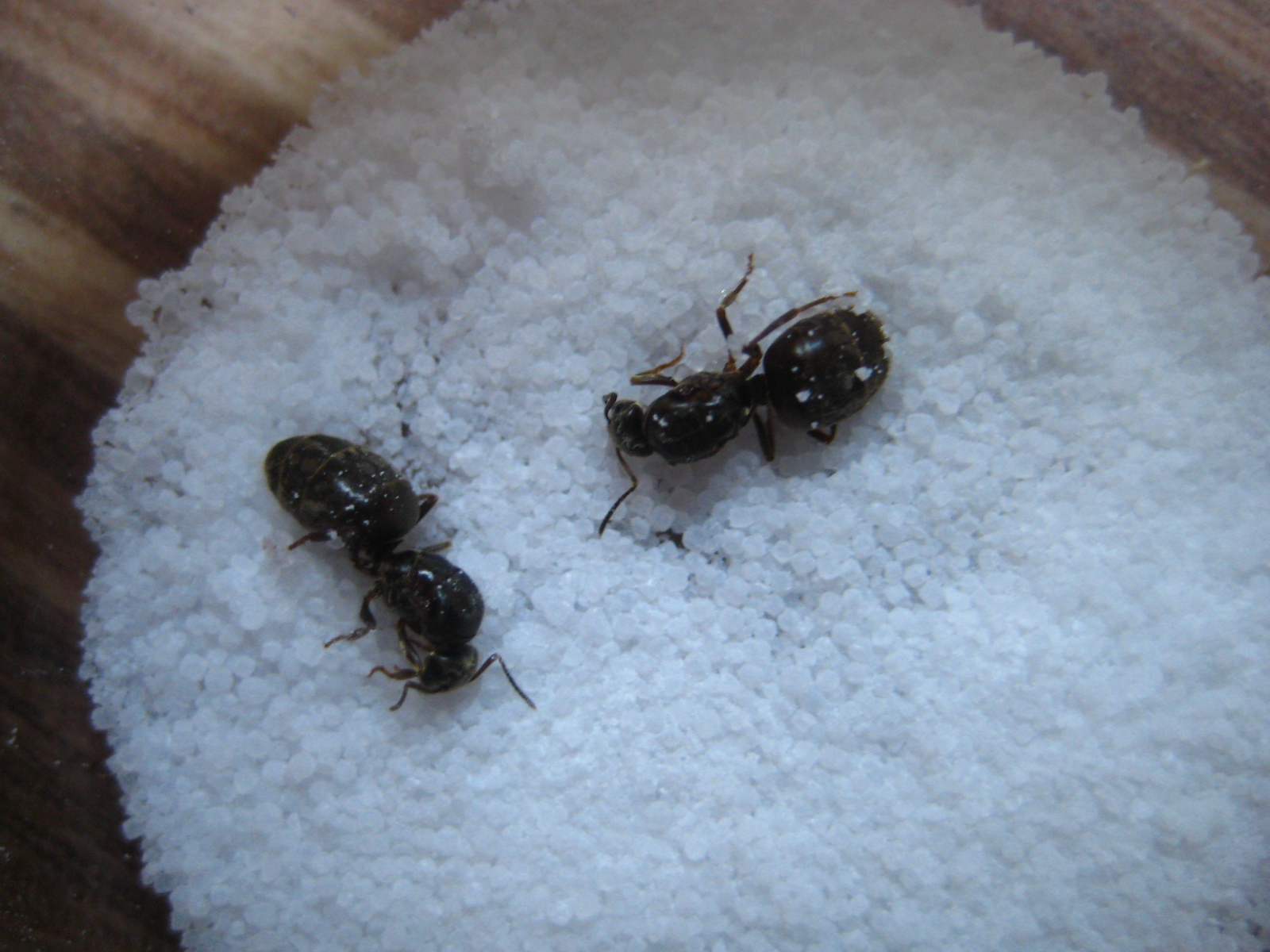 Nach ca. 20min zeigten sie die ersten Lebenszeichen, in Form von einem Beinzucken, ich befreite sie also vorsichtig mit einer Nadel vom restlichen Salz. Ich verteilte es anfangs auf den ganzen Körpern, da die Ameisen wirklich nass waren.