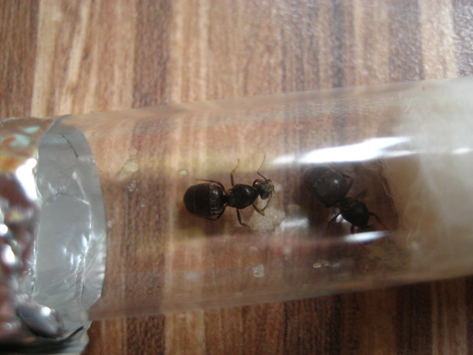 Als ich gestern meine Reagenzgläser der gründenden Lasius Arten kontrollierte und genau anschaute, vielen mir durch die rote Folie zwei fast quer übereienander liegende Gynen auf, welche ich in Pleometrose gründen lasse. Es handelt sich um Lasius cf. niger. Hm? seltsam dachte ich. Was da wohl los ist? Buckelfliege?