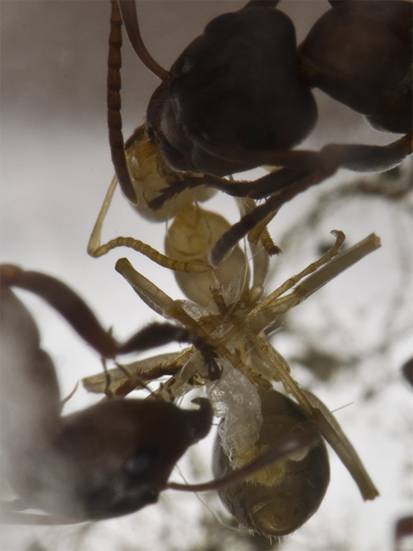 Ist schon eine Weile her, dass die Bilder entstanden. Die Myrmica sp. Kolonie konnte sich damals durchsetzen und errichtete ein Zweignest. Hab vor ein paar Tagen noch einmal nachgesehen, es gibt wieder einige Scharmützel. Alles in allem das bekannte Bild: Teilweise unkontrollierte Vorstöße der Myrmica sp. Arbeiterinnen mit panischem Weglaufen und geordnete Reihen der Lasius sp.:
