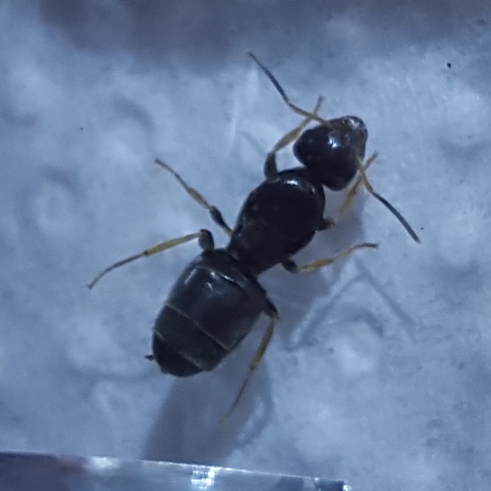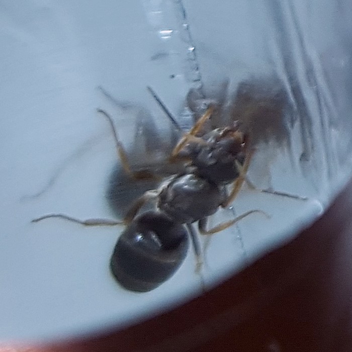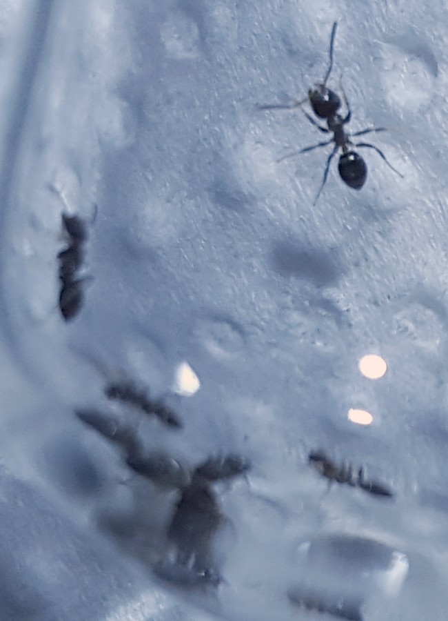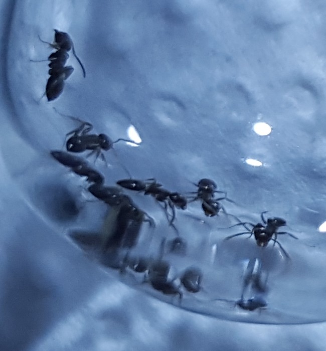 nochmal fast eine Stunde gedauert hat - ich wollte wirklich sichergehen, auch jedes Individuum aufzufinden) und in ein einzelnes Reagenzglas (ohne Wassertank) über den Wattestopfen hineinbucksiert. Damit diejenigen, die sich bereits im RG befanden, nicht wieder herauslaufen, habe ich zuerst einen Streifen Alufolie über den Mittelteil geklebt - das hat auch interessanterweise ganz gut geklappt, darunter haben sie sich dann gesammelt. Da das aber nicht genug war, habe ich etwa 1 cm vom Innenrand des RGs mit Parafinöl eingestrichen - ab da konnte ich es ruhiger angehen. Da sie über den Wattestopfen ins RG gelangten, habe ich den immer soweit hineingeschoben, dass die Ameise nicht mit dem Öl in Berührung kam.