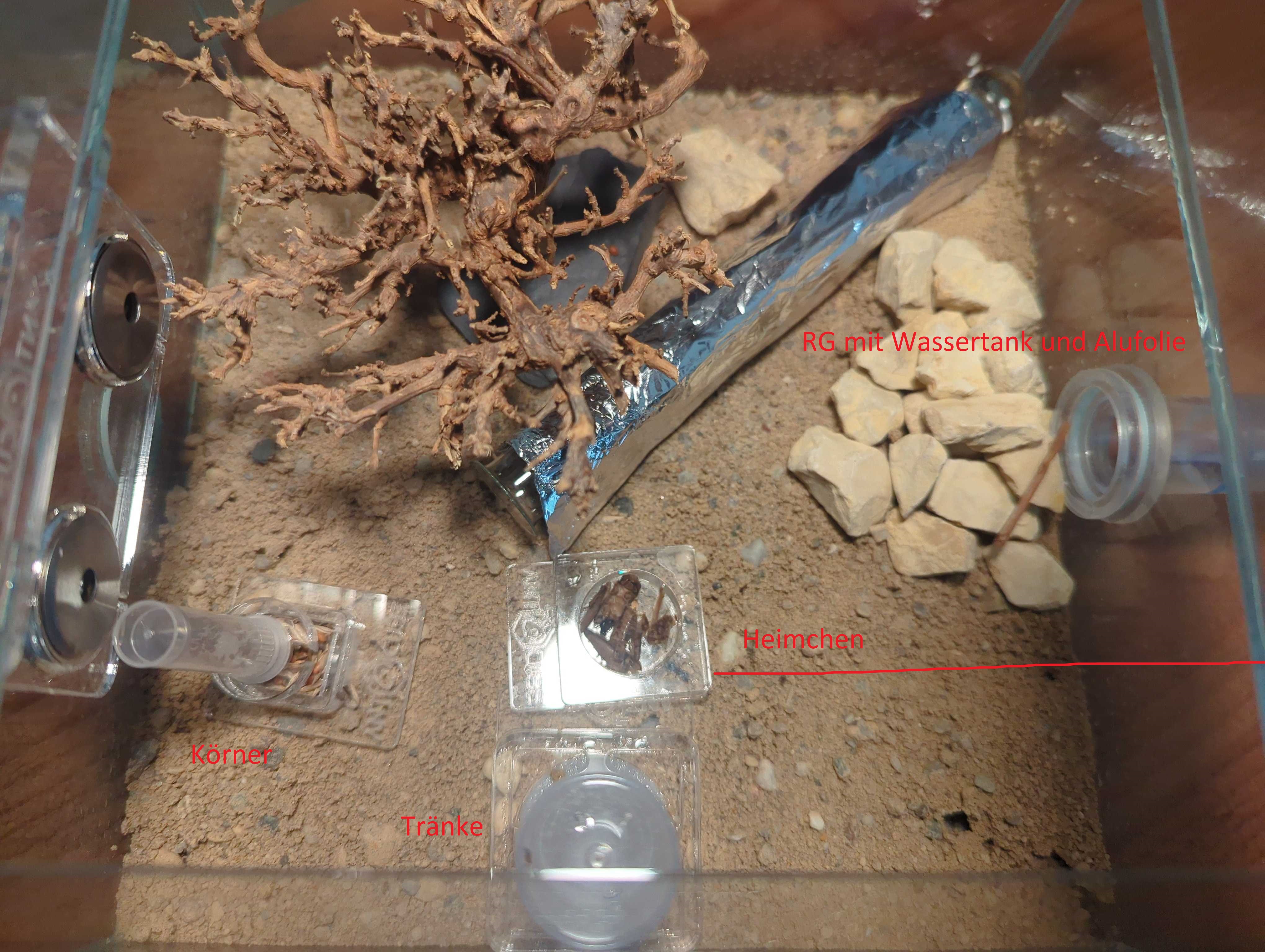 Und ja, verschließ die Nester erstmal, ehe sie sich da verirren. Abdunklung und Feuchte des Wassertanks machen das RG vielleicht schon attraktiver zum Umzug, wärmer machen, also beheizen, wirkt dann oft ganz schnell und bewegt zum Umzug.
