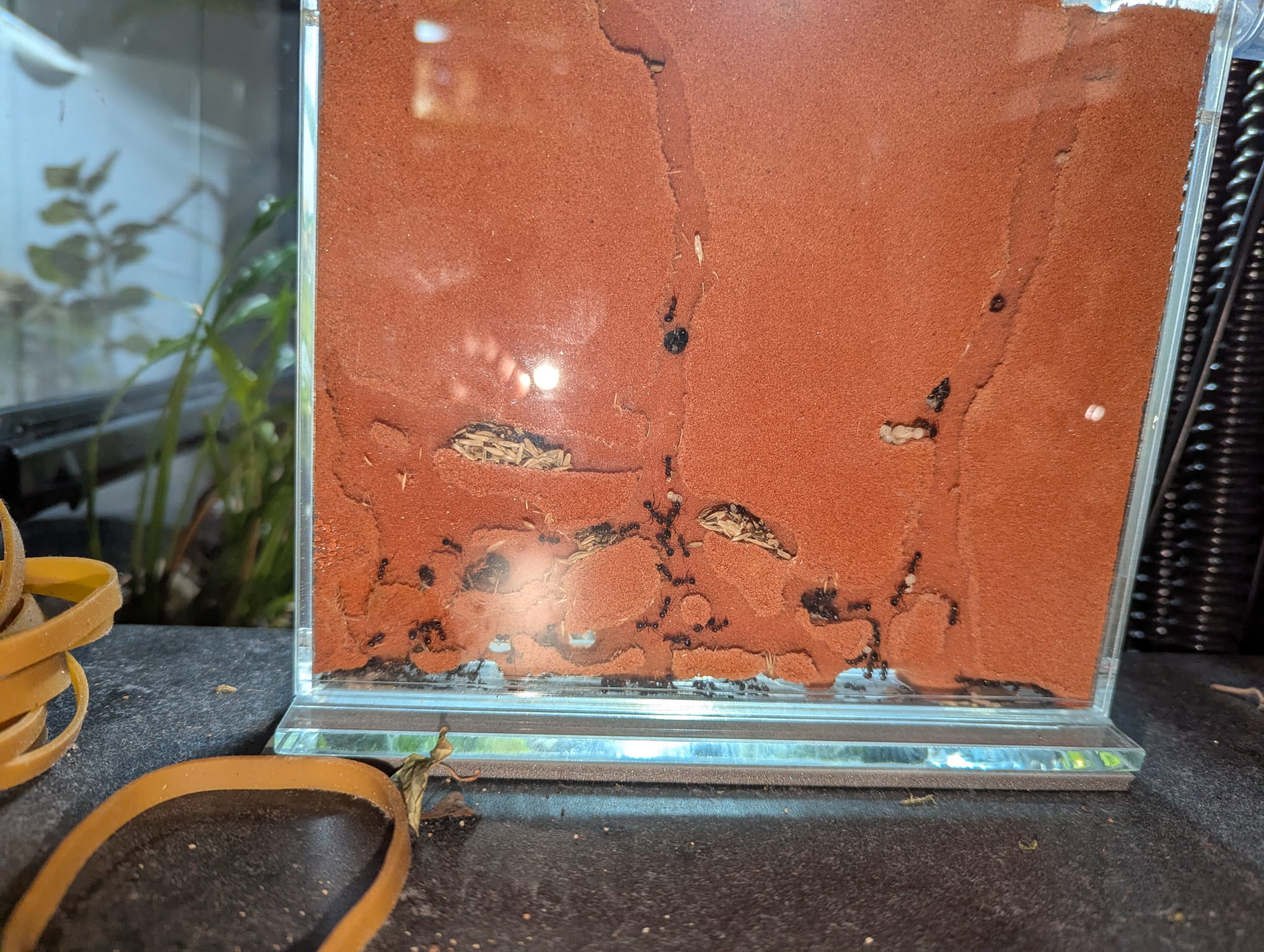 Kurzum gesagt: Deine Arena ist viel zu groß für diese winzige, schutz suchende Kolonie. Eine Gründerkolonie hat keinen großen Radius, die werden nicht deine ganze schöne Arena mit Nest erkunden, sondern sich einen sehr lokalen Ort als Schutz suchen, an dem sie ihreBrut aufziehen können, und von dort aus werden sie sich über die nächsten Monate vorsichtig voran tasten. Im Moment interessiert sich die Kolonie nicht für deine Arena, Dekoration oder großen Nester. Sie wollen einen dunklen, geschützen Ort zur Brutaufzucht.
