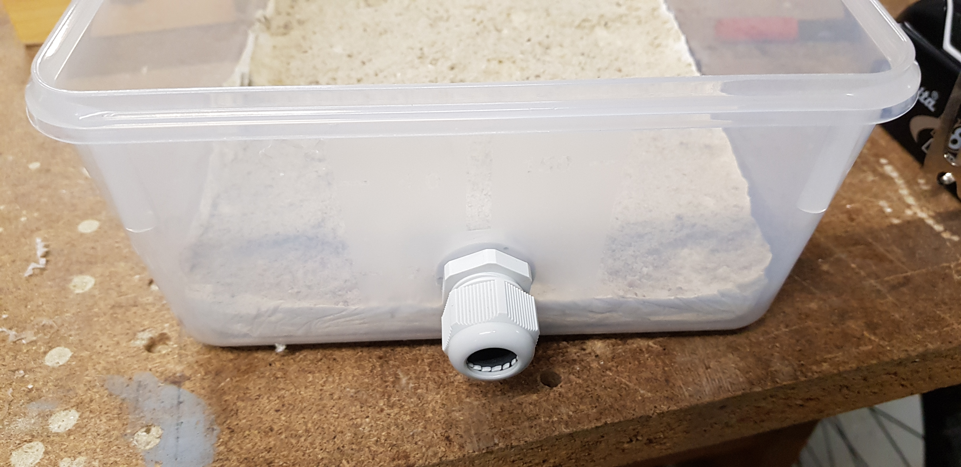 Gips anrühren und die Box ausgießen. Zum Gips anrühren sei folgendes gesagt: Ich habe einen sogenannten Elektriker Gips verwendet. Ein großer Nachteil dieses Gips ist das er sehr sehr schnell fest wird! Man muss also zügig arbeiten. Mir ist der Gips leider zu schnell fest geworden. Warum? Ich habe den Gips wie gewohnt ( dazu muss man sagen das ich Elektriker bin und somit in meinem Leben schon Tonnen an Gips angerührt habe ) gemischt und cremig gerührt. Dadurch zieht der Gips schnell an. Um dies zu vermeiden sollte man den Gips flüssiger anrichten. So macht man sich auch das Leben leichter wenn man die Box dann damit ausgießt. Sorry für den Sand am Foto aber ich hätte beinahe mal wieder vergessen ein Foto zu machen. :D