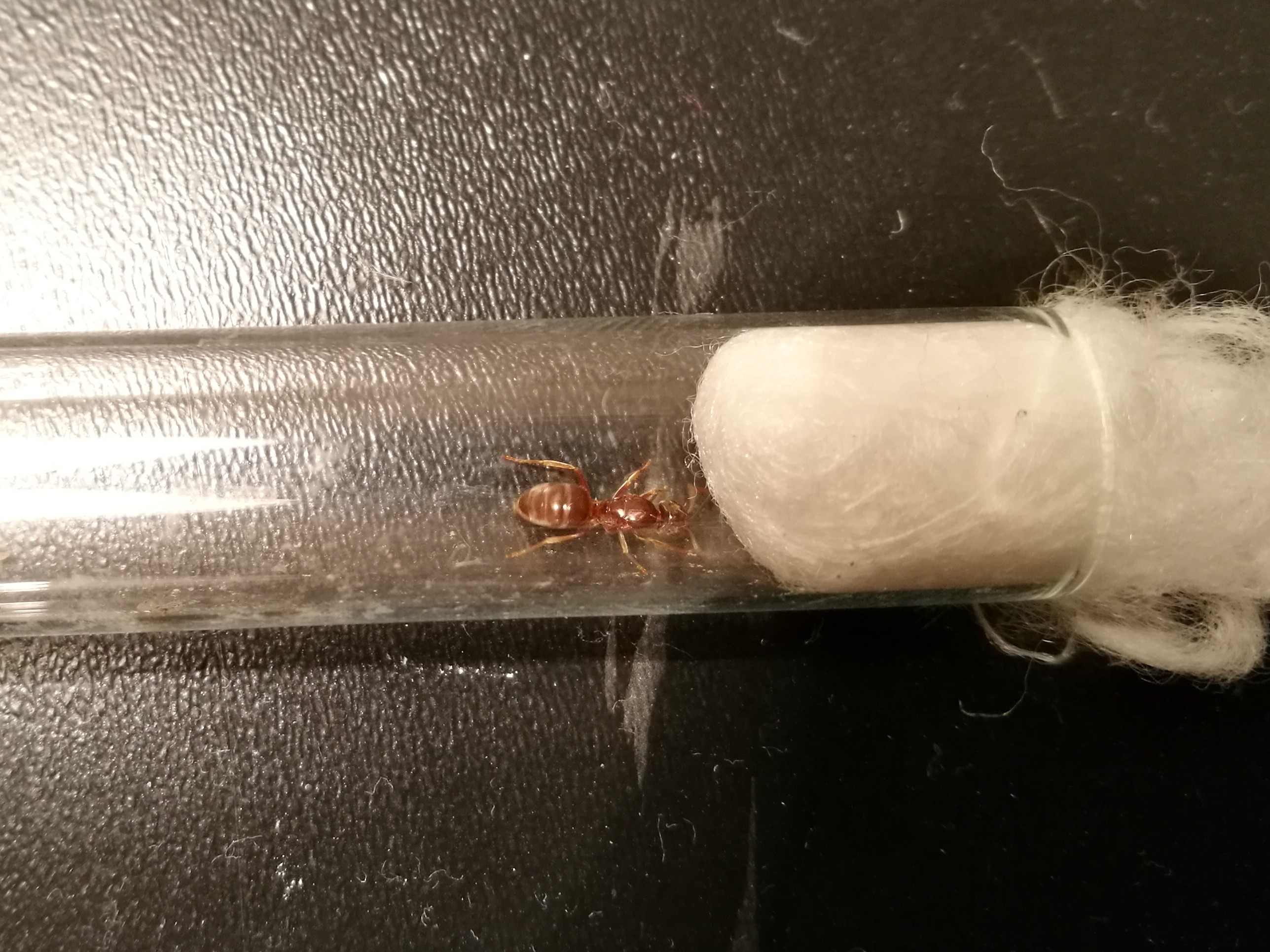 Nun würde ich gerne erreichen, dass die Arbeiterinnen die Umbratus-Königin annehmen. Ich las dazu im Internet, dass diese sich in ein Nest schleichen, eine Arbeiterin töten und ihren Geruch dadurch annimmt und dann von der Kolonie aufgenommen wird. Daher fügte ich dem Reagenzglas mit der Königin eine Arbeiterin hinzu und warte nun, ob etwas passiert.
