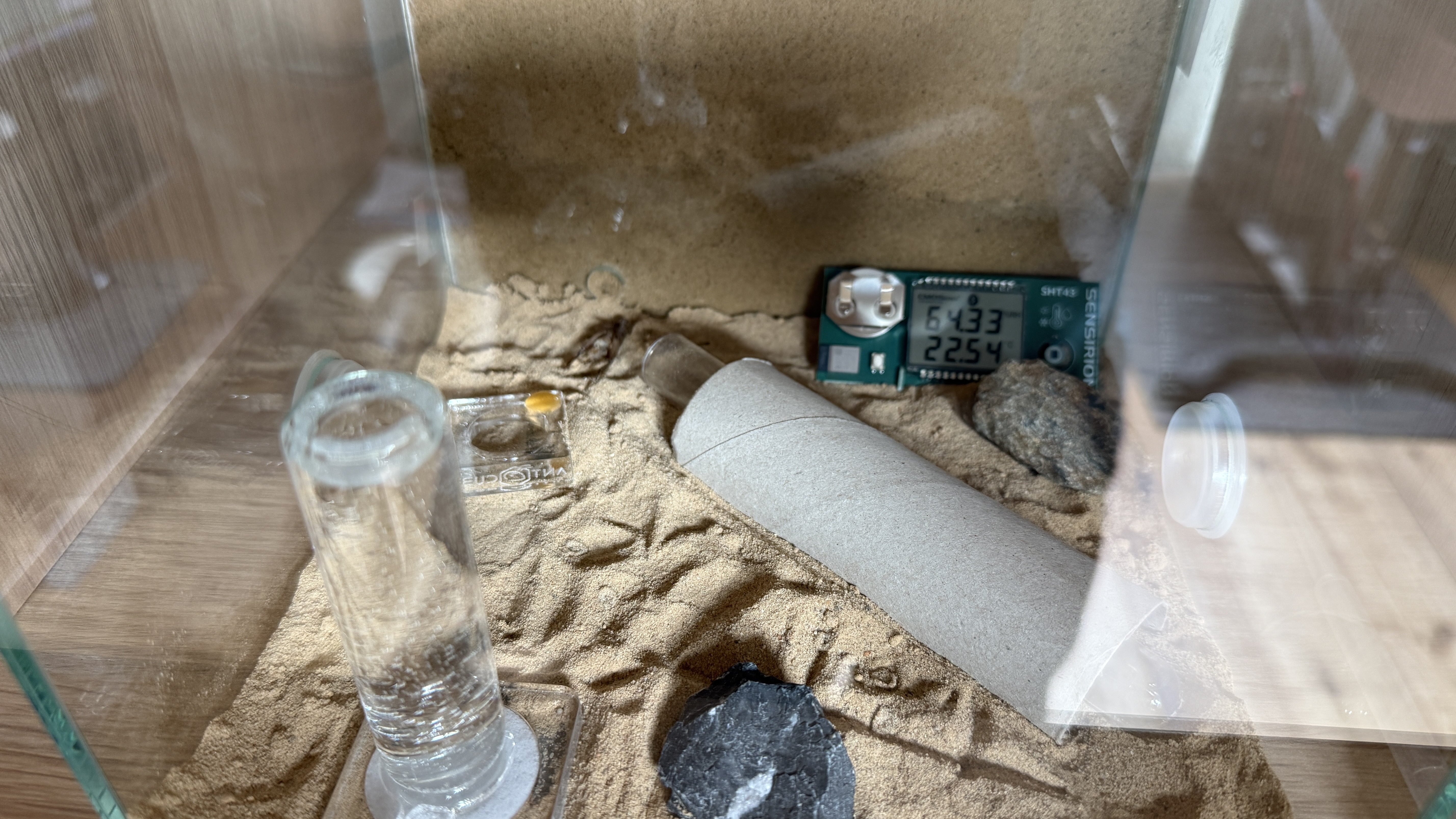 Ins "Nest" möchte ich nicht gucken, da ich mit meiner anderen Kolonie (Messor barbarus) schlechte Erfahrungen gemacht habe und die Gyne alle Eier aufgefressen hat, nur weil ich nachschauen wollte, wie es ihr geht.