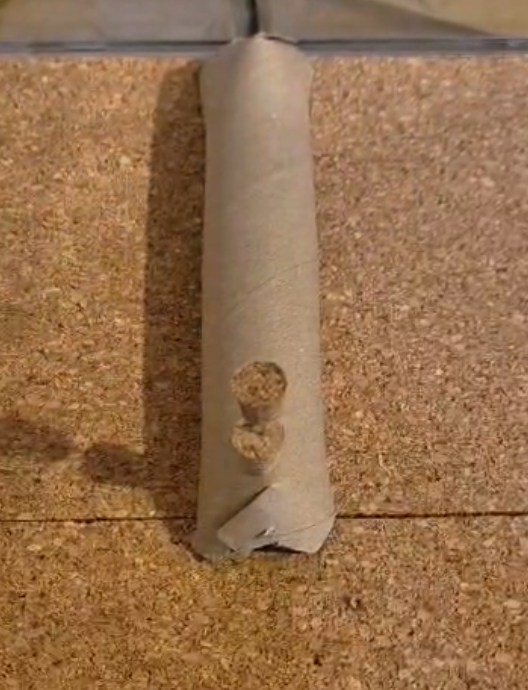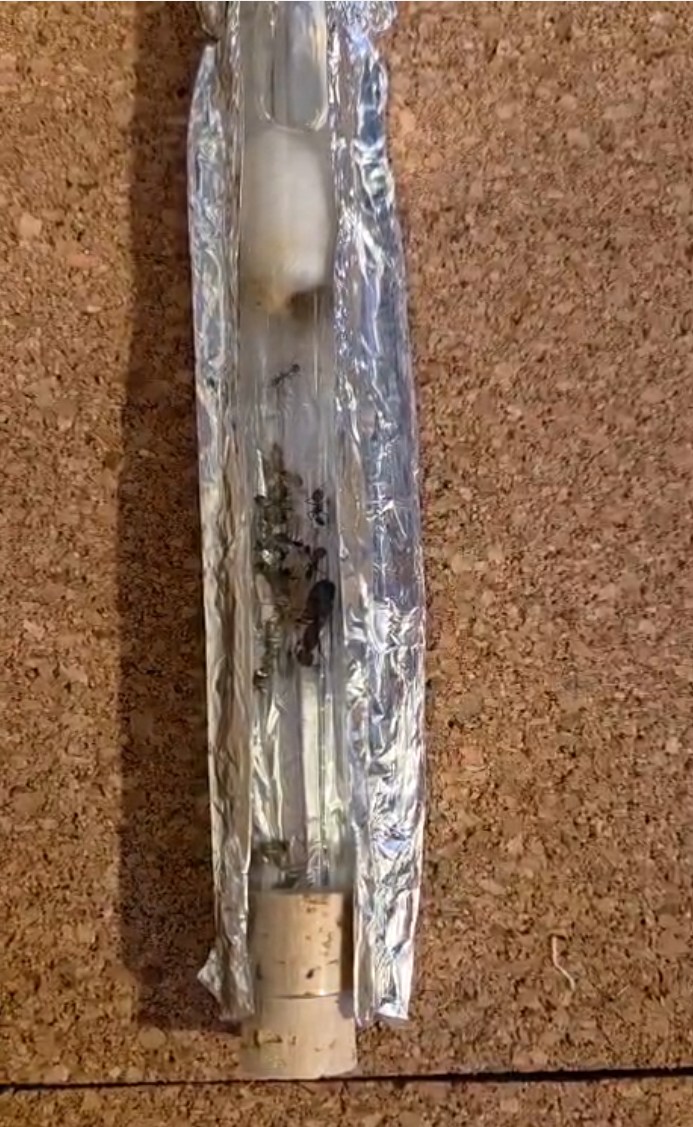 Die Ameisen habe ich am 20. Dezember erhalten. Eine Königin, zwei Arbeiterinnen und einige Puppen konnte ich entdecken. Aktuell sind sie in einem Reagenzglas in einer 30x20cm Arena mit Korkboden. Täglich bekommen sie frisch eine halbe und nochmal geviertelte Assel. Die Assel war vorher gefroren. Manchmal überbrühe ich sie noch kurz, manchmal lasse ich sie einfach auftauen. Daneben bekommen sie täglich einen frischen Tropfen Honigwasser und haben immer ein Reagenzglas mit Zuckerwasser und ein zweites mit Wasser zur Verfügung. Die Temperatur halte ich zwischen 26 und 30 Grad und die Luftfeuchtigkeit in der Arena bei rund 50%.
