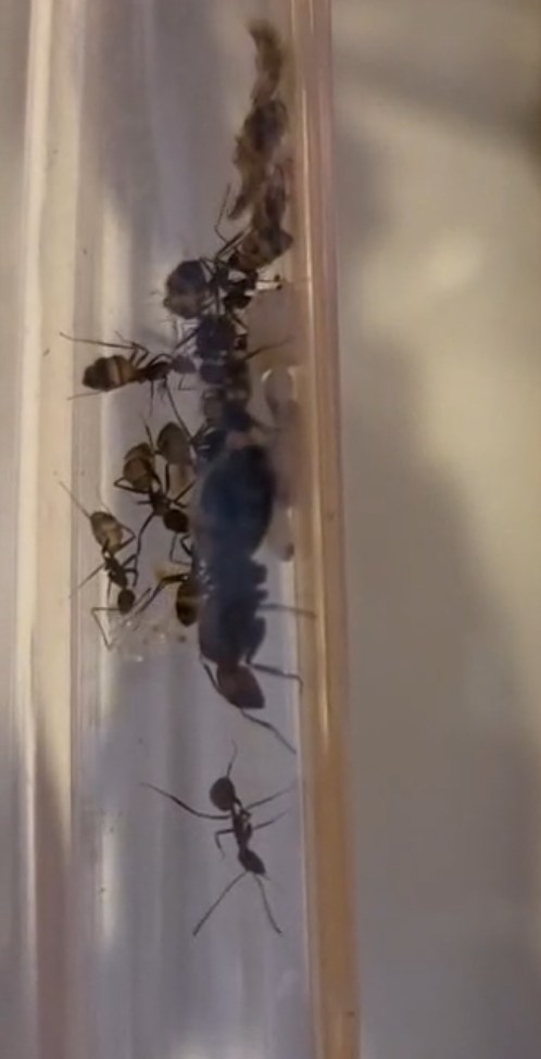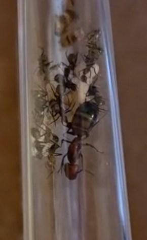 Ich habe den Eindruck es geht der Kolonie aktuell gut. Es sind nun 10 Ameisen, Königin und ich glaube sowohl Eier als auch Larven und Puppen zu erkennen. Auch die Gaster scheinen mir gut gefüllt zu sein. Auch zu sehen sind einige kleine Asselsstückchen, welche sie ins Nest transportiert haben.