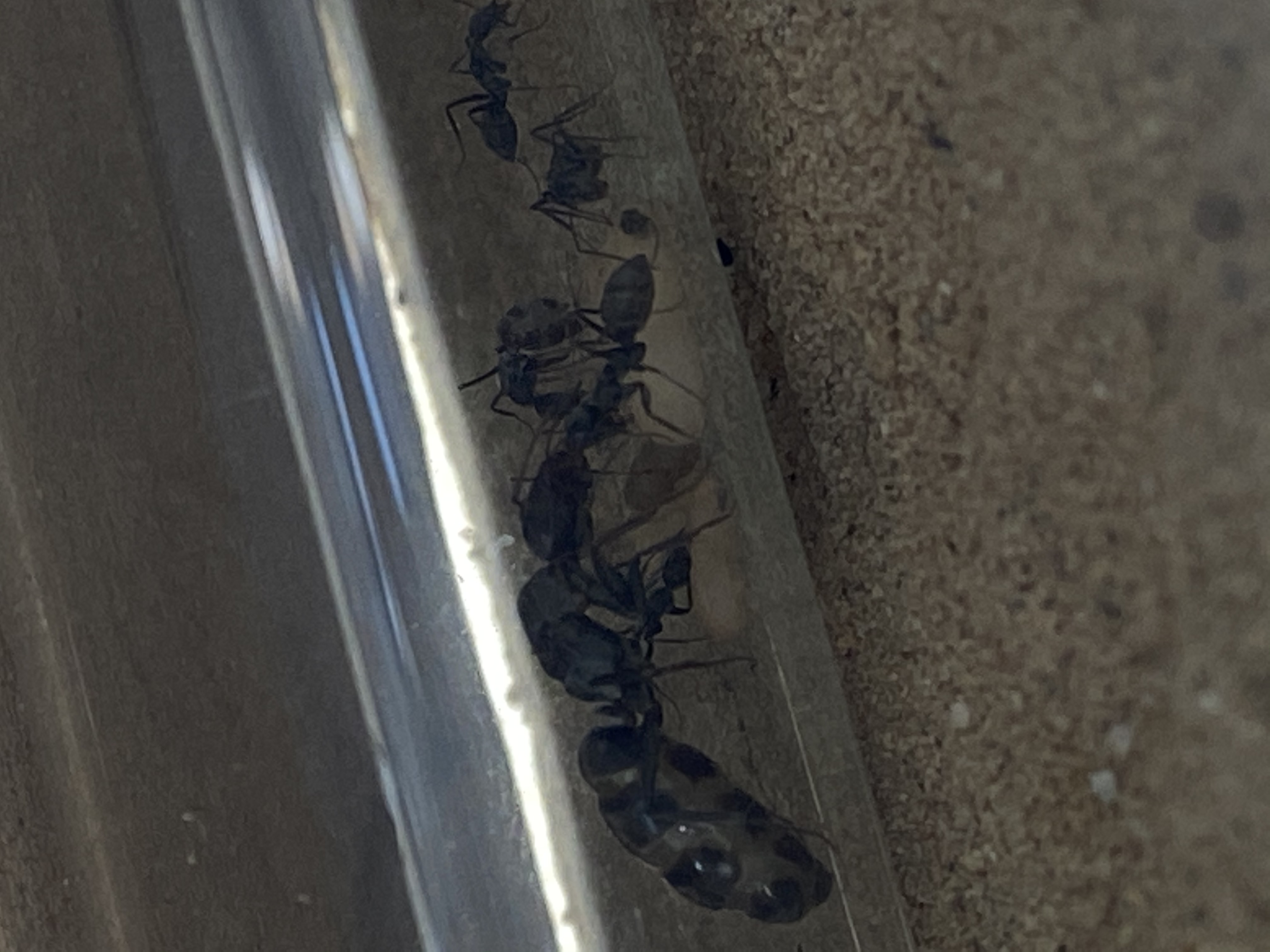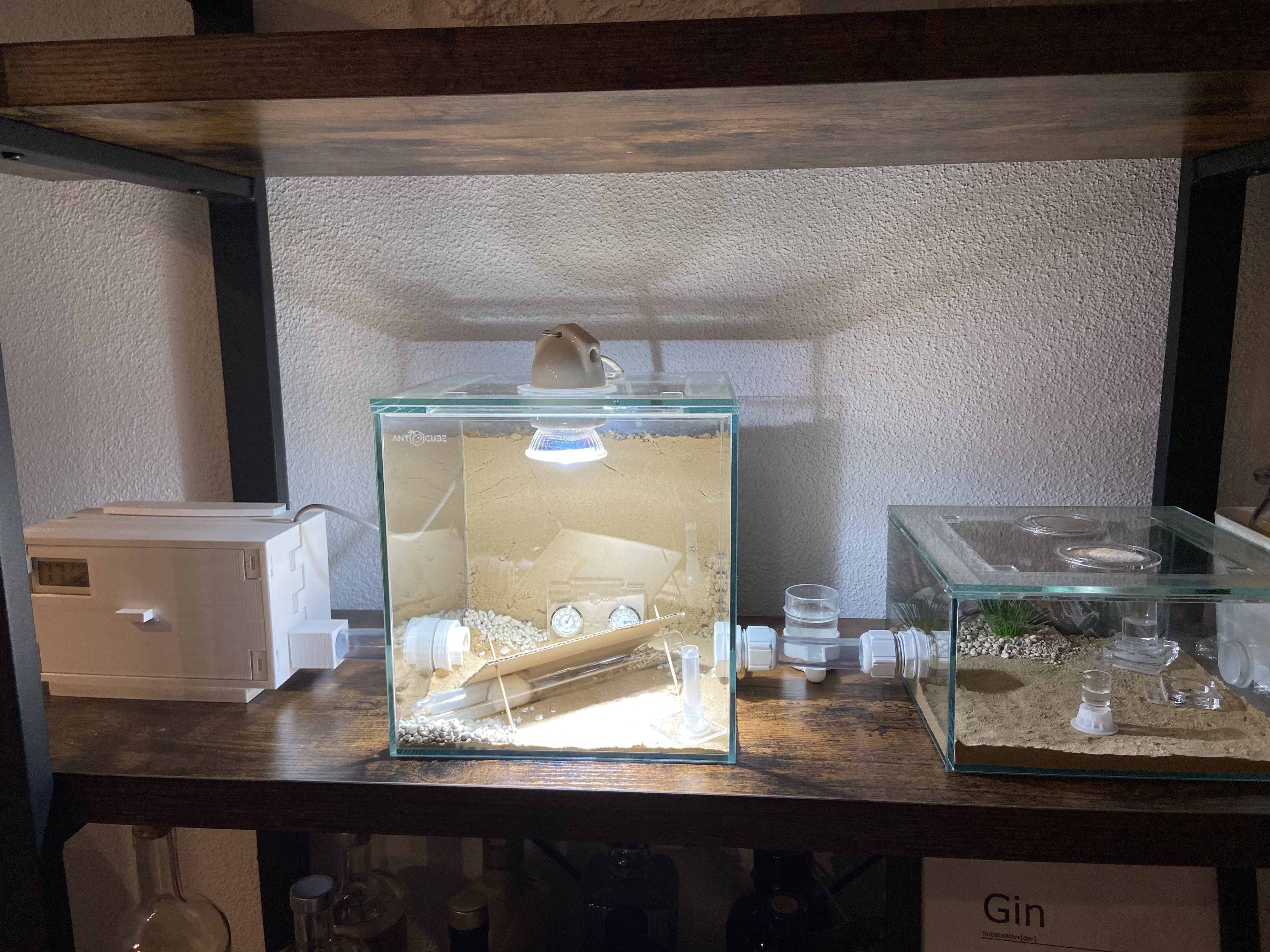 Aber, wie ihr nun eventuell erkennen könnt, ist der Platz zwischen Cube und darüber liegendem Regal sehr gering. Ständig dotze ich beim Wassertausch oder beim Füttern oben an und bringe das ganze Regal zum Wackeln. Daher habe ich nun doch eine weitere Arena angeschlossen und diese wurde auch sofort erkundet. Nahrung wurde auch entdeckt, gemeldet und von mehreren Ameisen konsumiert
