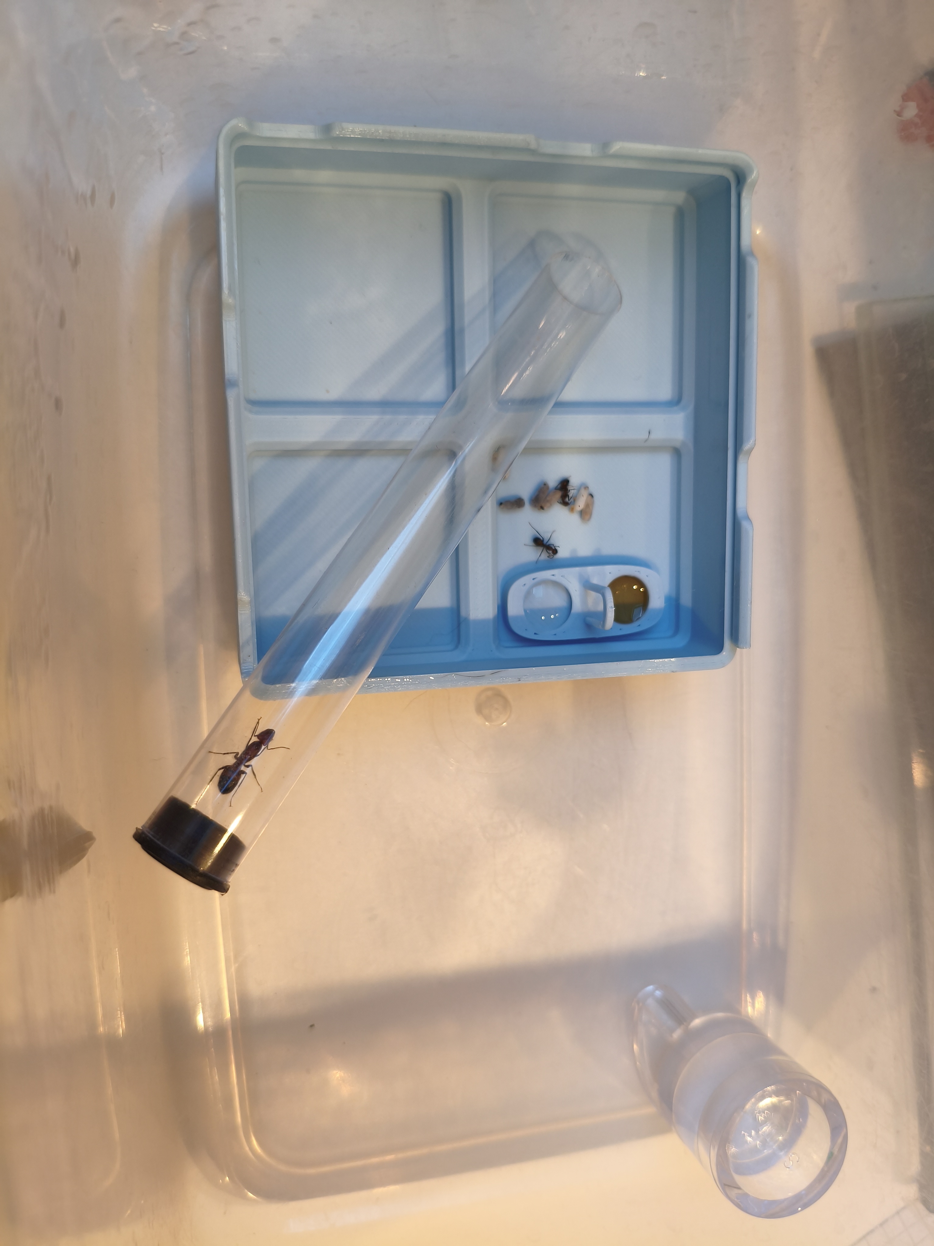 Leider habe ich mein Kind bei der regelmäßigen Fütterung der Ameisenkolonie nicht ausreichend unterstützt, das Volk ist vermutlich verdurstet oder verhungert. Die Tränke hat leider auch nicht richtig funktioniert.