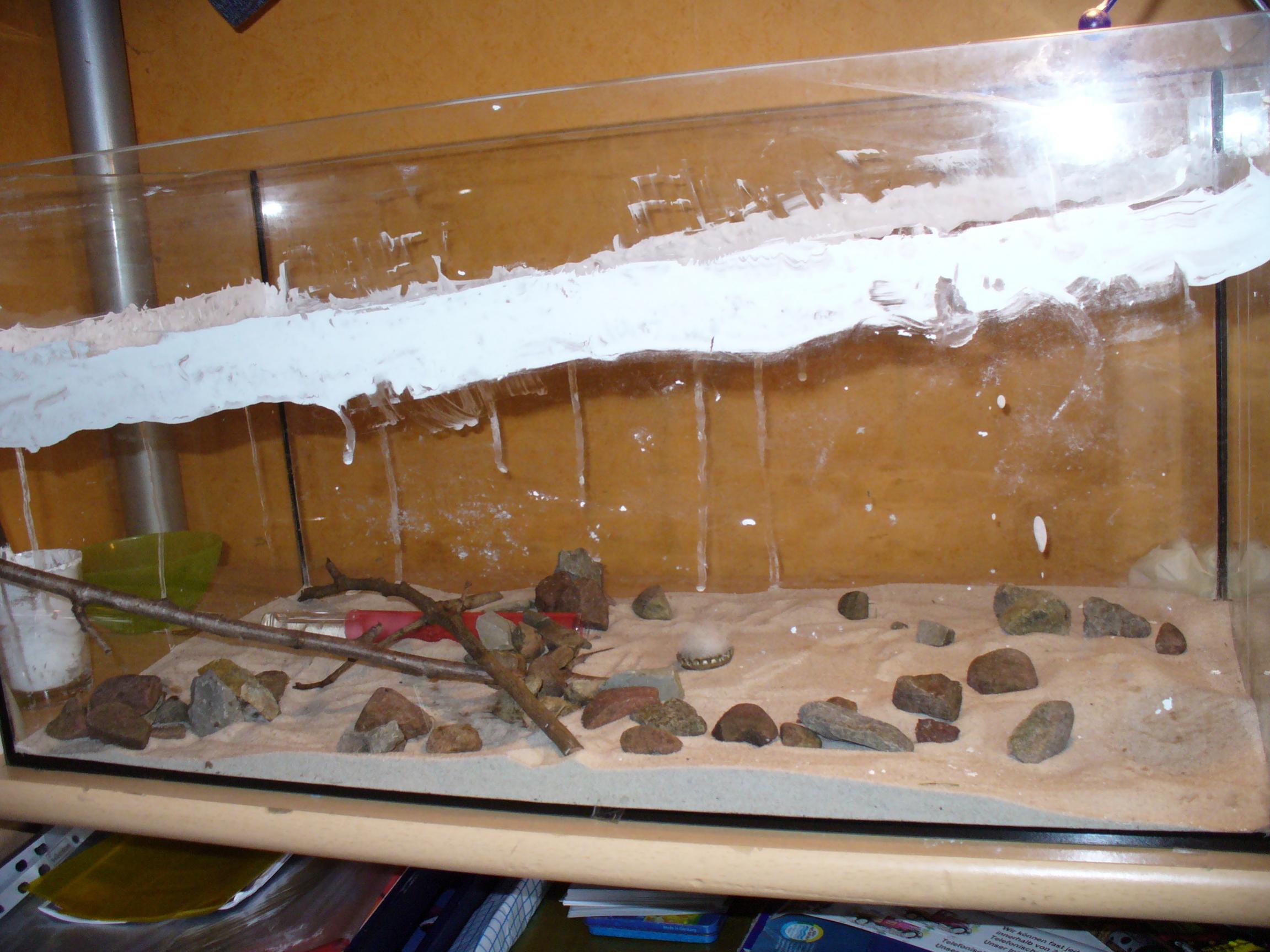 Den Arenaboden kannst du mit kleinen Kieseln noch etwas grober machen, damit die Meisen besser drauf laufen können. Wenn du ihn mit so einer Wassernebelspritze besprĂŒhst und es abtrocknen lĂ€sst, "verkleben" sich die Körner etwas, sodass der Belag auch etwas fester wird.