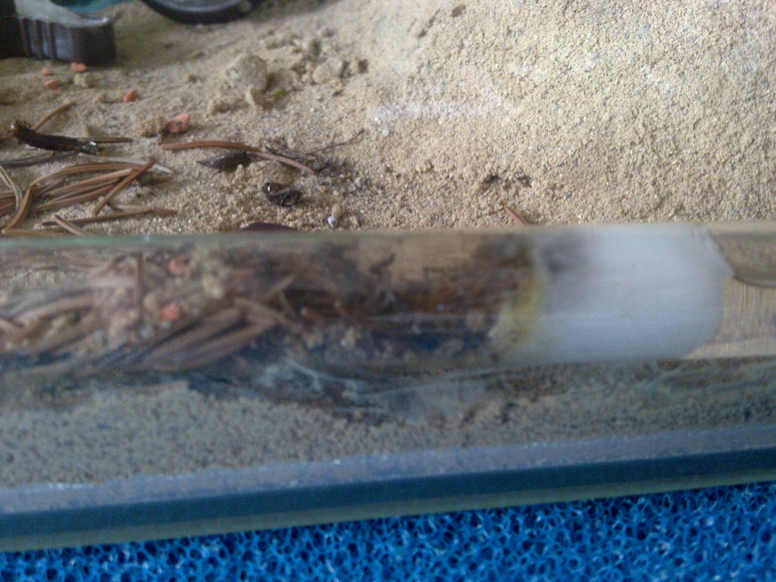 Ein Freund wies mich darauf hin, das es doch sehr seltsam sei, das ich so wenig Eier und Larven habe. Er hat gleichzeitig mit mir angefangen Ameisen zu halten und hat Stapelweise Eier und Larven. Mich selbst hat dann gewundert, wo die ganzen Eier denn sind. Ich habe die Königin viele Eier legen sehen, bzw die Arbeiterinnen grosse Stapel rumtragen sehen, aber es gab dann keine Larven. Daraufhin hab ich die Folie mal weggemacht.
