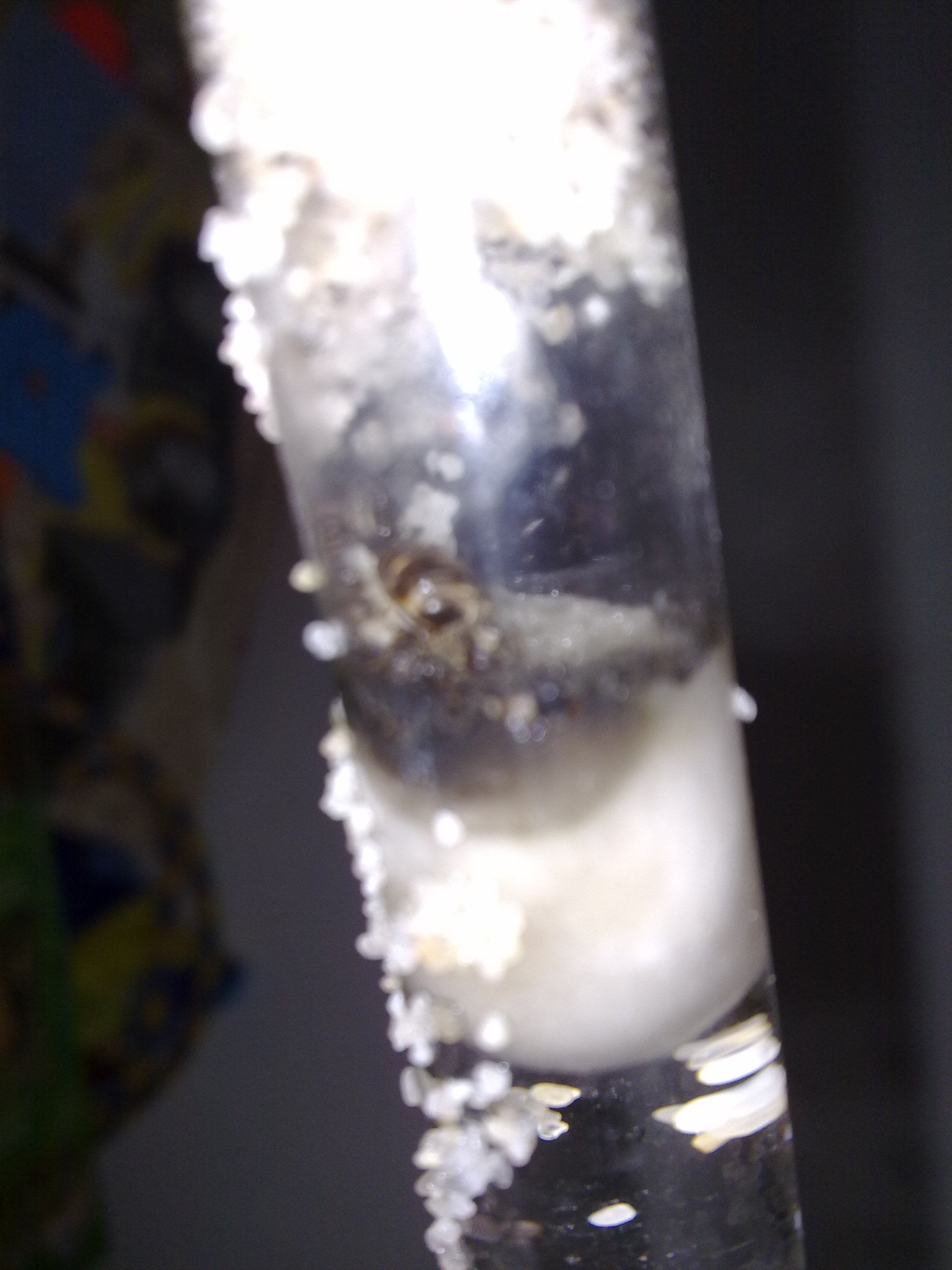 Die Kolonie lebt immer noch im Reagenzglas, allerdings habe ich das in eine Dose getan, damit ich ihnen Nahrung anbieten kann. Das klappt soweit alles ganz gut. Nun hat sich aber seit einiger Zeit Schimmel (vermutlich, Watte ist Schwarz geworden) in/an der Watte zum Wassertank gebildet. Da ich wollte, dass sie jetzt am besten noch vor der