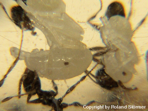 Bei dem 6. Bild, speist die Pheidole pallidula an einer Fleischwurst.