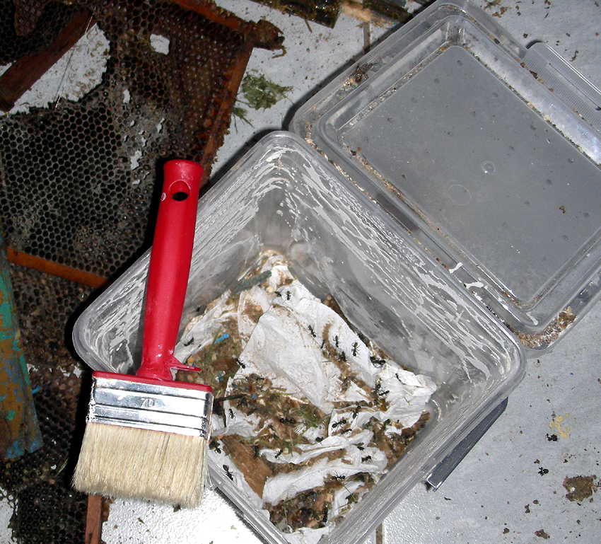 Schicht für Schicht trug ich die Hölzer und die sehr klebrigen Wabenteile des zerkleinerten Bienennestes ab. Die Ameiseneinsammel-Party hatte begonnen. Ohne eine Verletztung konnte ich die Ameisen mit dem Pinsel in die Box abstreifen und es ging ziemlich schnell voran.