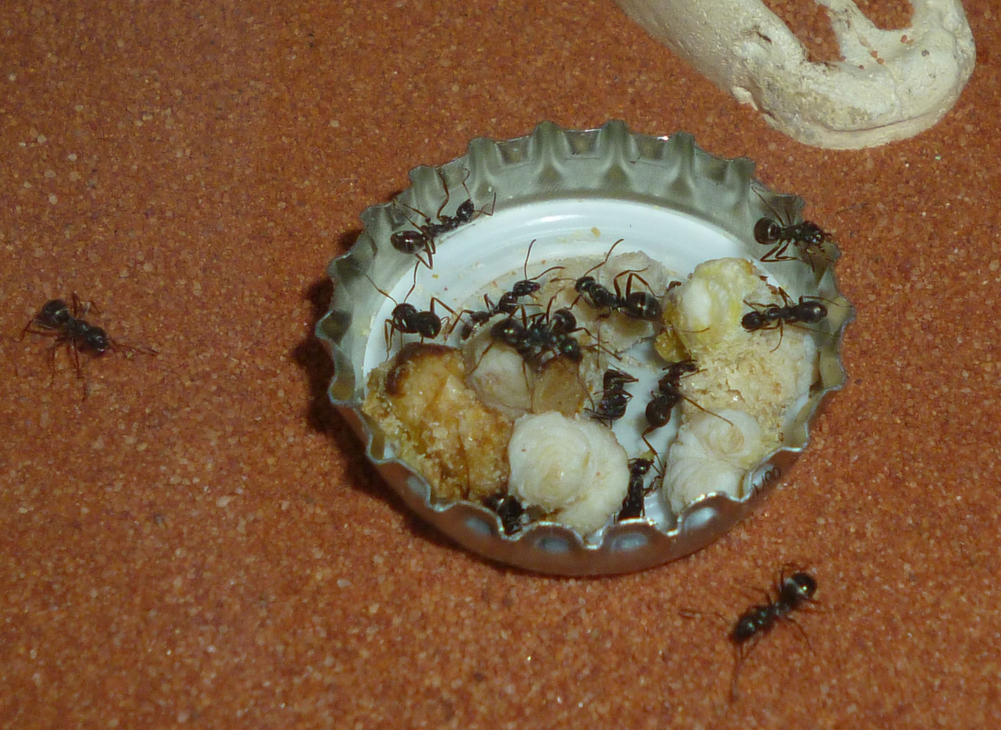 Das Holznest wurde zuletzt bereits in geringem Maße genutzt, während die Ameisen es zu Beginn regelrecht gemieden haben. Die Idee hinter dem Holznest, und der Anordnung zwischen Becken und Ytongnest, soll ja die Situation in der Natur ein Stück weit nachstellen. Dort findet man