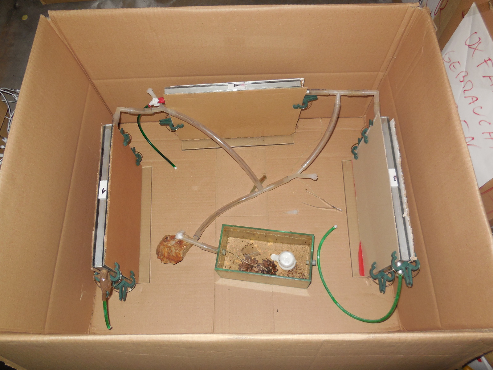 Seit heute befindet sich die Kolonie im Kühlschrank. Wohl dank der Wärme hatte sich ein ganzer Schwung nicht in die Farmen zurückgezogen, sondern blieb in der Arena. Also stellte ich zunächst alle Teile der Anlage, d.h. inkl. Arena, bei 13-14 Grad in den Kühlschrank in der Hoffnung, die Tiere durch die Kühle etwas träger zu machen. Leider hielt sich der Erfolg in Grenzen.