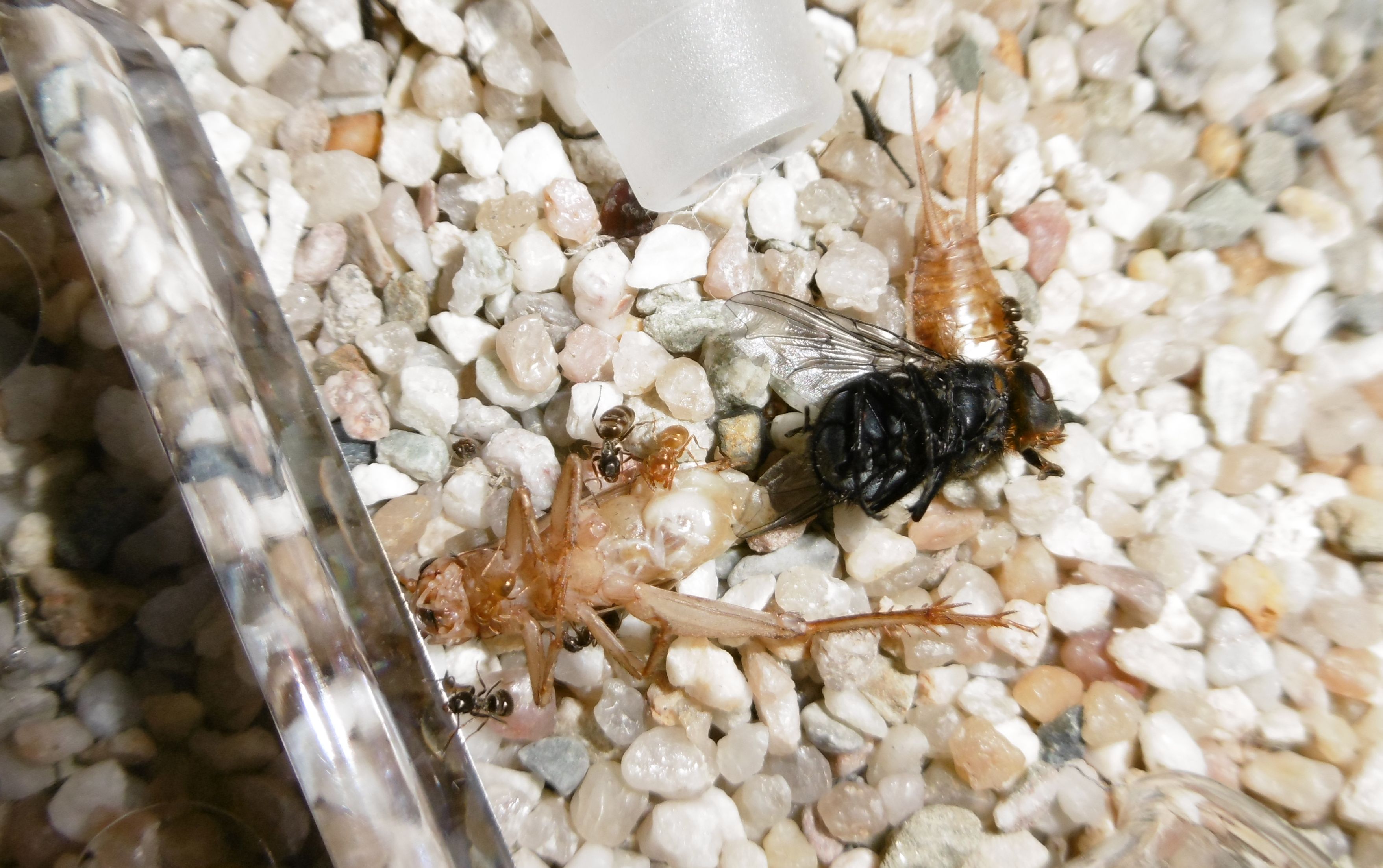 Heute hat es ein zerteiltes Heimchen und eine Fliege gegeben. Wirtsarbeiterinnen und Chthonolasius-Arbeiterinnen beteiligen sich gemeinsam am Zerlegen der Futtertiere: