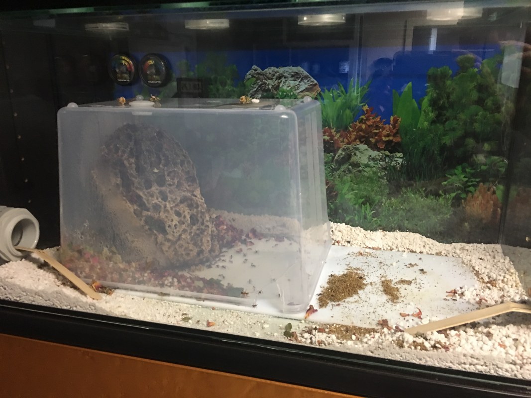 Dieses Becken habe ich noch nie gereinigt, beinhaltet als so ziemliche alle bisher verstorbenen Tiere (2 oder 3 habe ich mal aus der Arena gefischt):