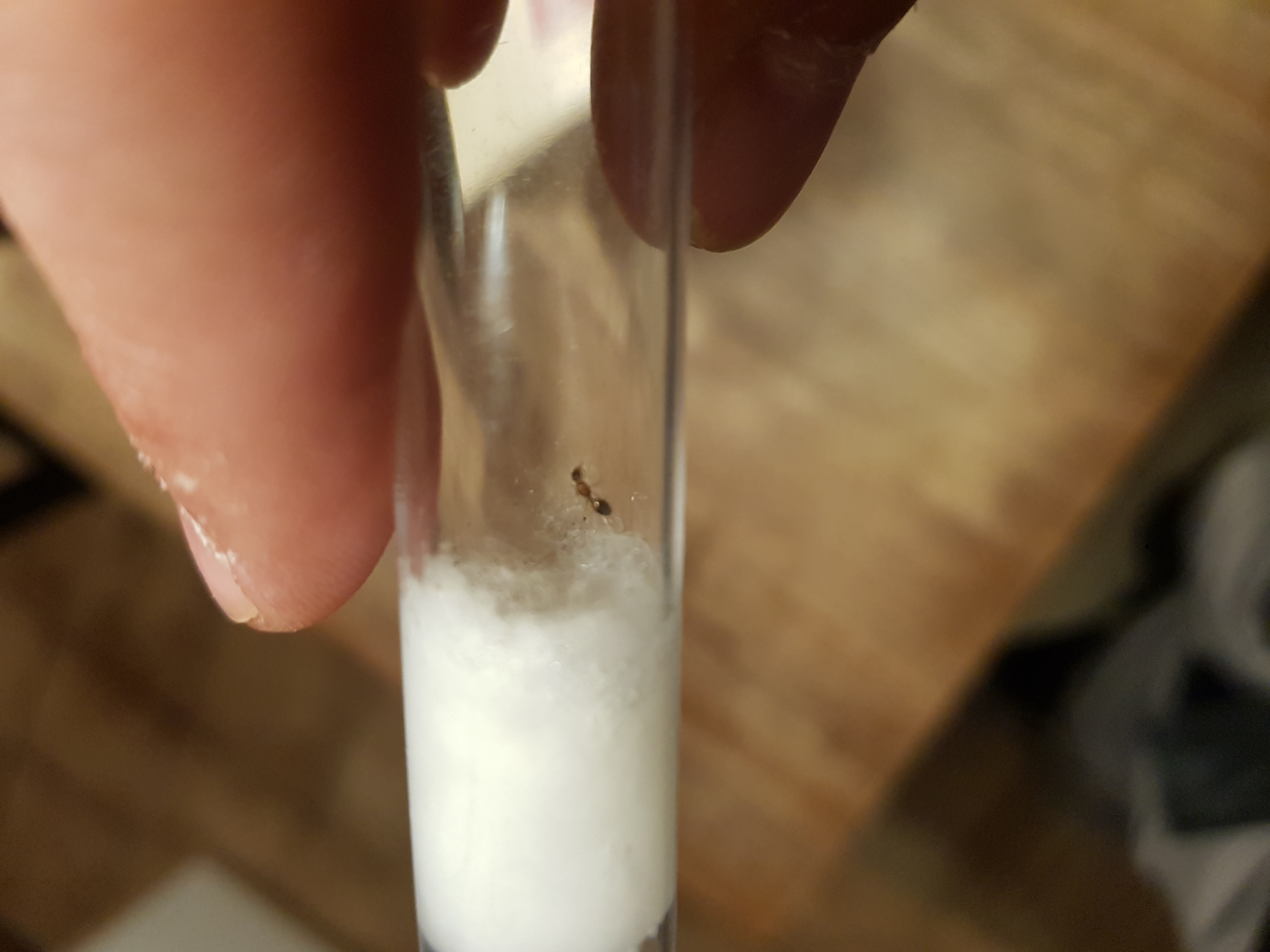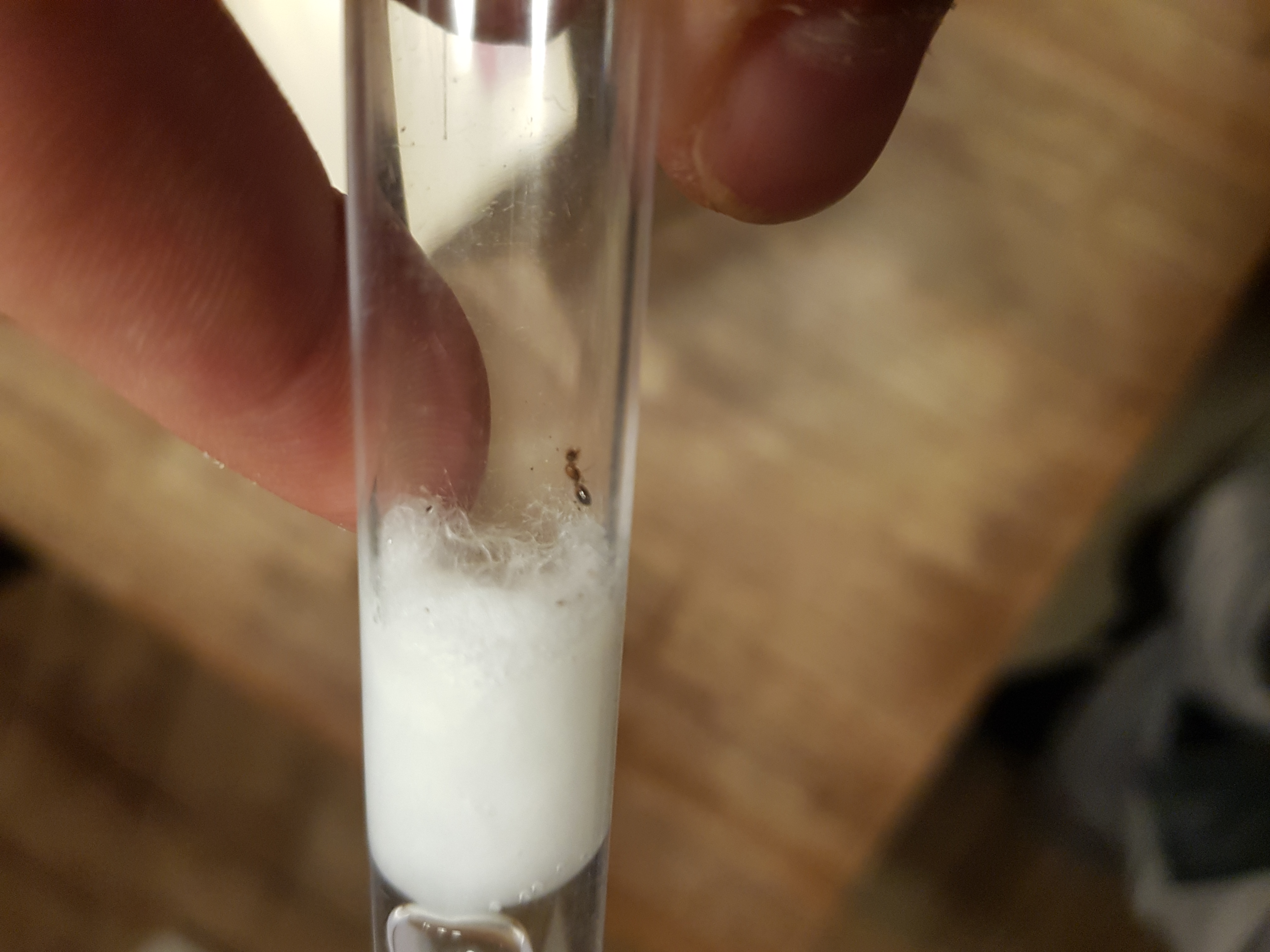 Das ist auf jeden Fall eine Königin, vermutlich Temnothorax sp.. Die nisten in der Natur in Totholz, Borke, hohlen Eicheln, Nüssen, Gallen und ähnlichen Kleinsträumen. Du kannst ihr etwas in der Richtung anbieten oder die Watte so weit rein schieben, dass sie wirklich minimalen Platz hat.