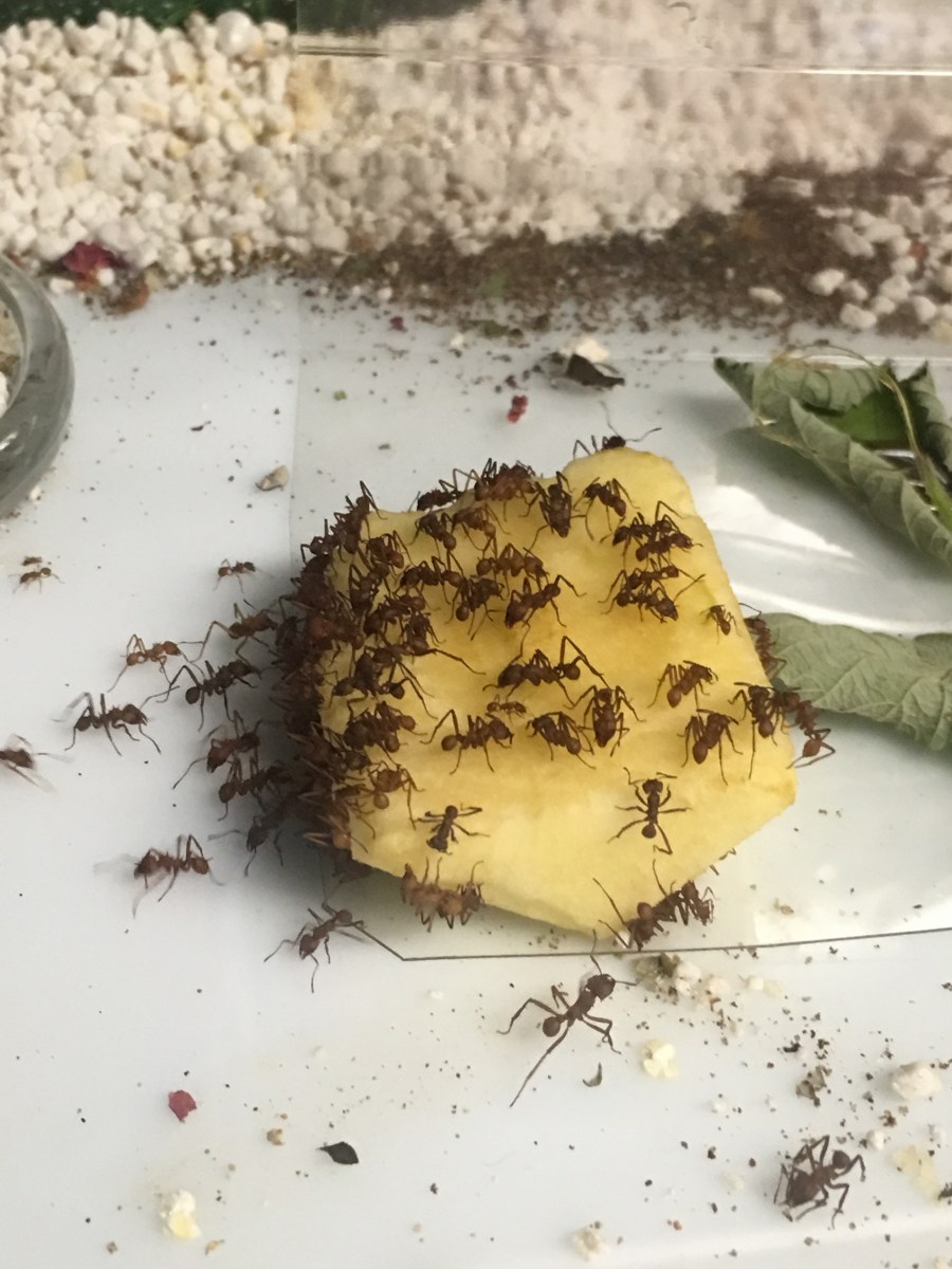 Interessanterweise wird dies in aller Regel Rudel-Artig organisiert, d.h. oft ist keine Ameise im Futterbecken zu sehen und irgendwann spĂ€ter sehe ich wieder eine ganze Gang ins Futterbecken rennen bzw. stolz mit der Beute zurĂŒck rennen