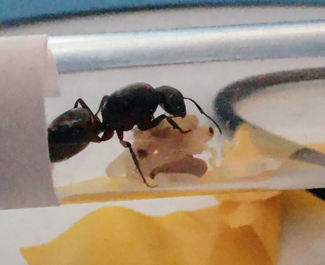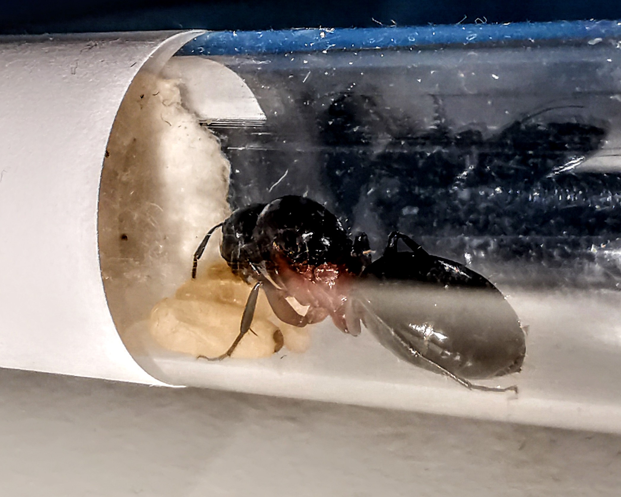 Hab vor ein paar Wochen eine Camponotus ligniperda Königin mit Brut erhalten. Die Winterruhe hat sie inzwischen beendet und sie wird jetzt bei 22C gehalten.