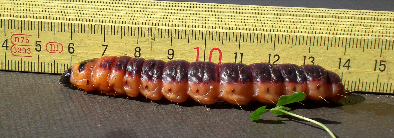 Wie man sieht ist die Raupe sehr groĂź, ganz ausgestreckt bis zu 10 cm lang.