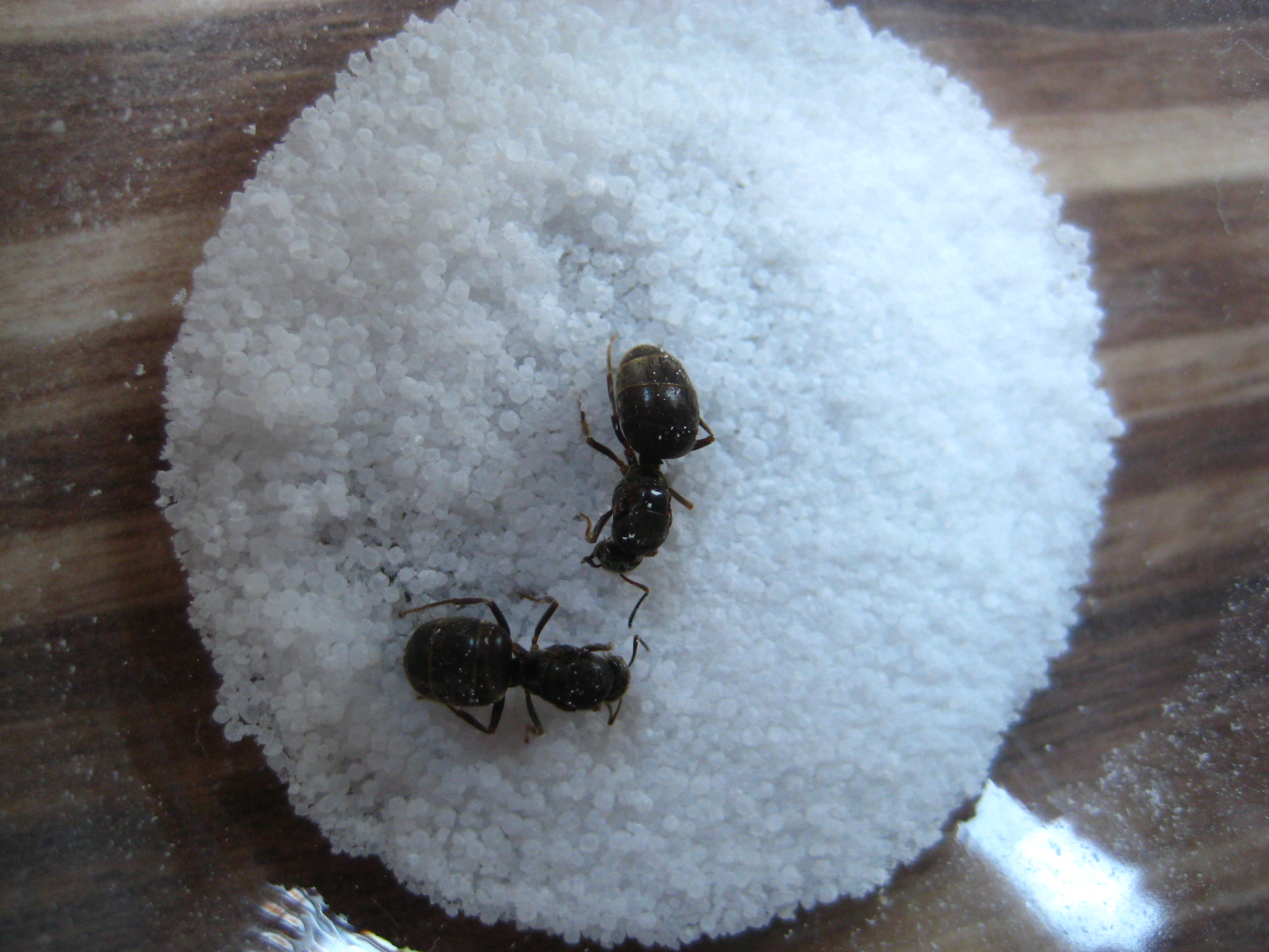 Nach ca. 20min zeigten sie die ersten Lebenszeichen, in Form von einem Beinzucken, ich befreite sie also vorsichtig mit einer Nadel vom restlichen Salz. Ich verteilte es anfangs auf den ganzen Körpern, da die Ameisen wirklich nass waren.