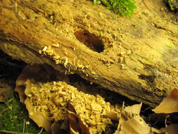 Dorcus titanus sumatra, Weibchen bohrte sich zwecks Eiablage in das Todholz