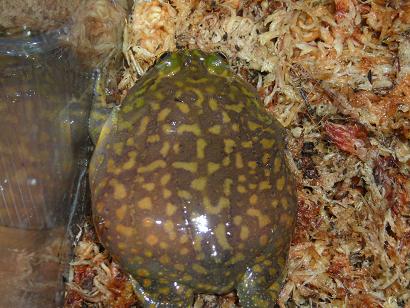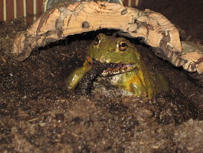 Pyxicephalus adspersus, hier schon etwas älter, ein wirklich hungriges Männchen, hier schon größer als die Faust eines starken Mannes ;)<br />Paralell hatte ich noch 4 Weibchen. Tolle Tiere!